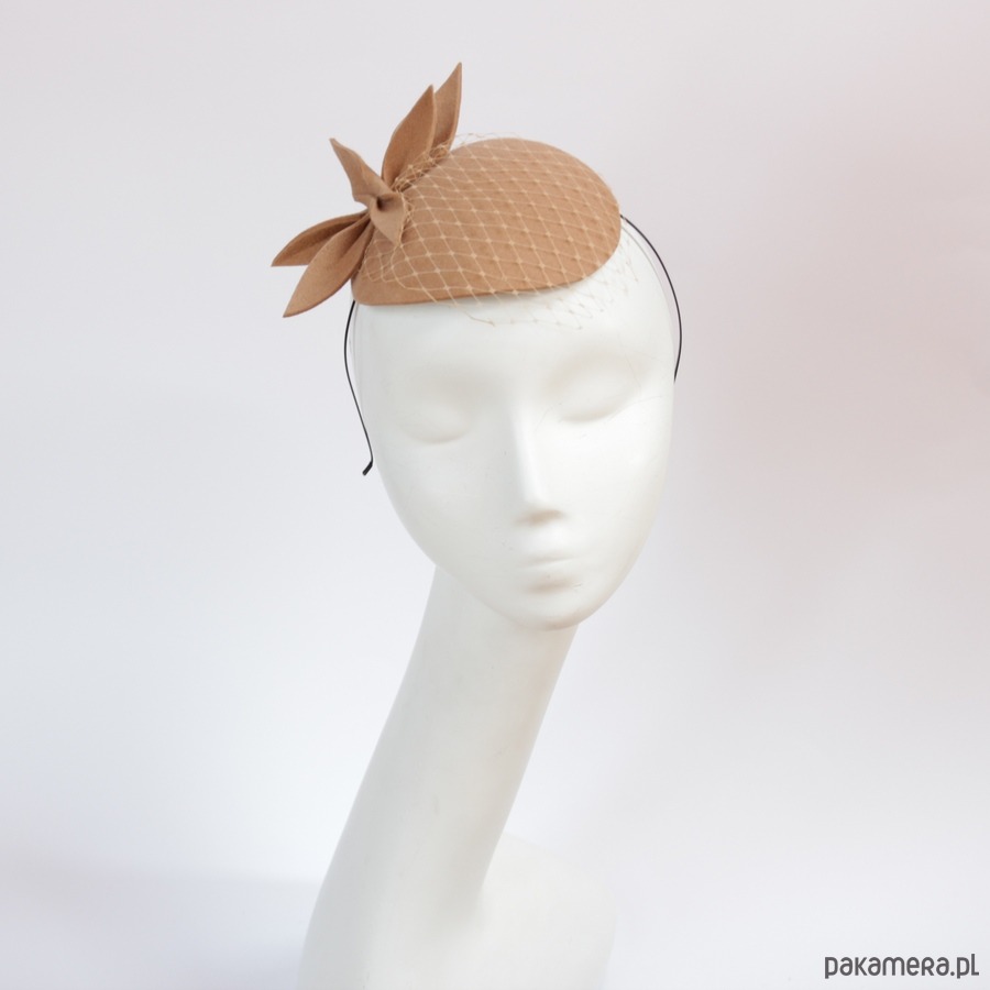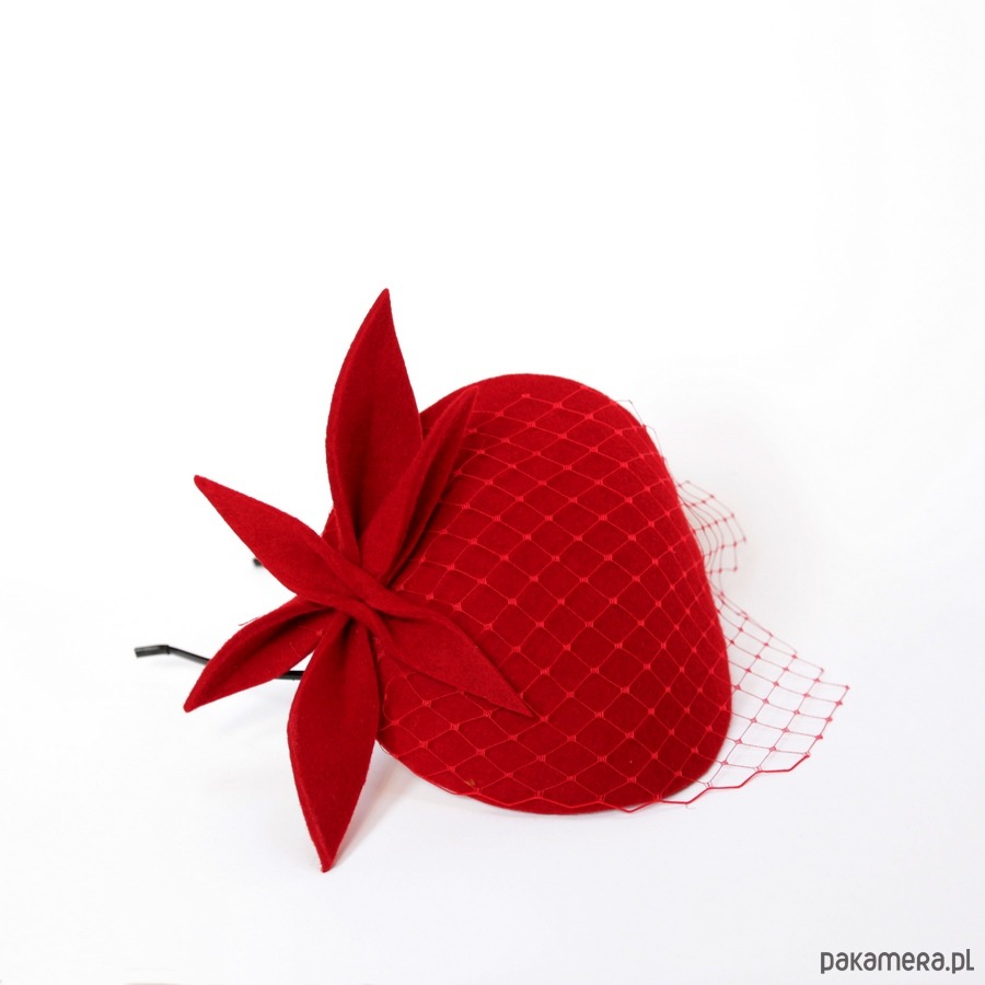 Mini toczek do włosów. Wykonany jest z filcu wełnianego, ozdobiony przestrzennym elementem i woalką. Rozmiar ok 11 -14 cm. Zamocowany na metalowej opasce w kolorze czarnym (możliwość zamiany na inny kolor-srebrny lub złoty, lub grzebyk)