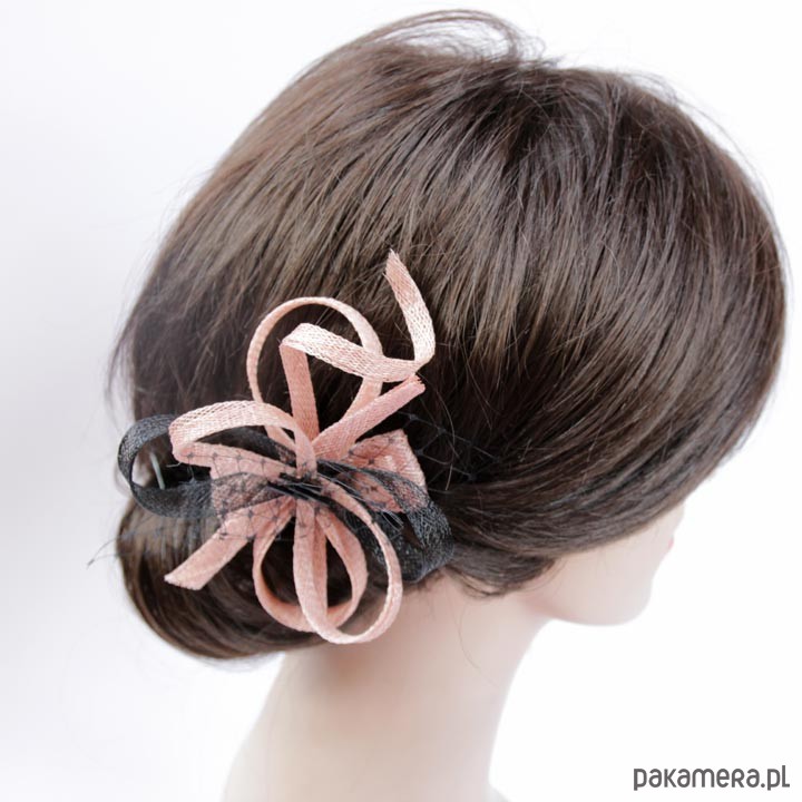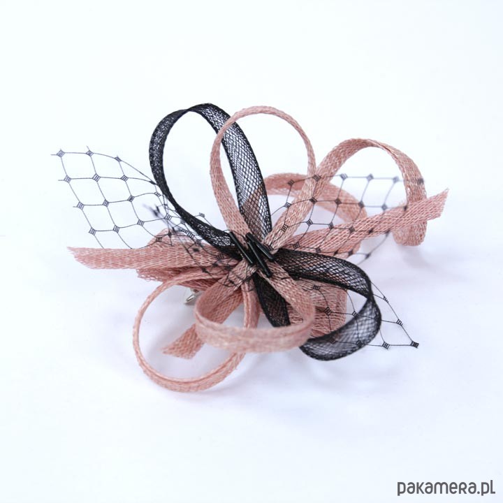 Przypinka do włosów wykonany jest z sinamay, Ozdobiona woalką i szklanymi koralikami. Kolor-pudrowy róż, czarny. Rozmiar ok 12-12 cm. Zamocowany na spince typu aligator .