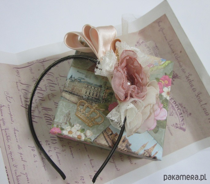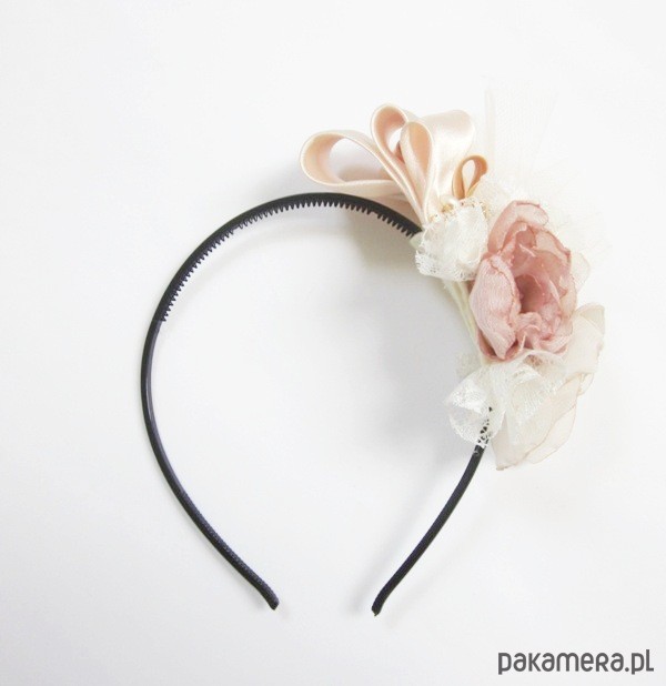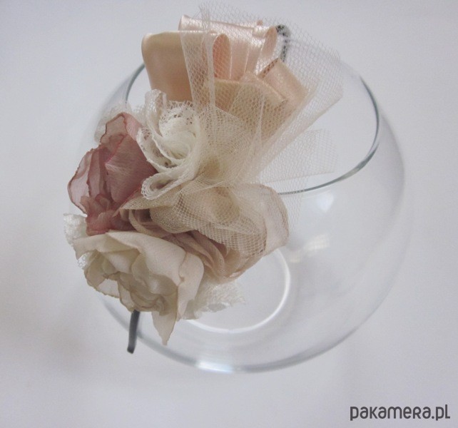 Niebanalny stroik wykonany wg autorskiego projektu z najlepszej jakości materiałów i dodatków krawieckich. Kompozycja kwiatowa utrzymana jest w pastelowej tonacji ze złotymi wstawkami (guziki, koraliki)(kolory materiałów od lewej nude, pudrowy róż, ecru). Całość zamocowana na plastikowej opasce w kolorze czarnym. Fascynator doskonale upiększa każdą kreację. Będzie stanowił oryginalny gadżet do niejednej stylizacji. Wielkość ok10x12cm.***Prezentowany fascynator jest utworem w rozumieniu ustawy z dnia 4 lutego 1994 r. o prawie autorskim i prawach pokrewnych.Wszelkie prawa zastrzeżone.