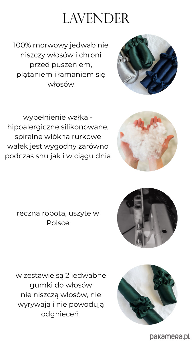Jest bardzo wygodny i delikatny podczas spania. Jedwab chroni przed puszeniem, plątaniem i łamaniem się włosów dzięki czemu stają się jedwabiste, odzyskują swój naturalny blask i gładkość.