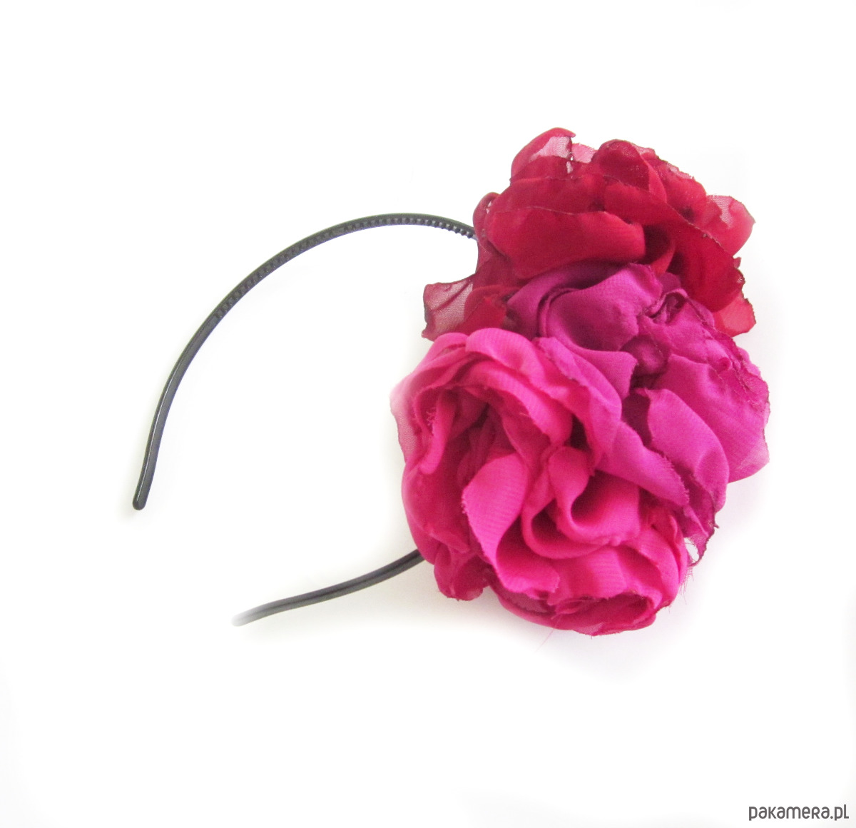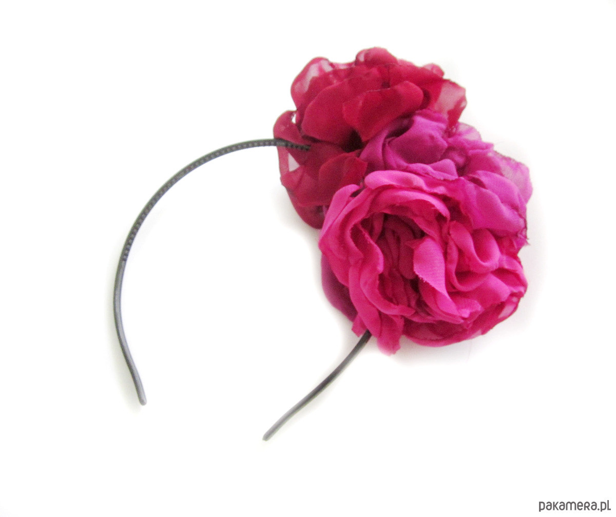 Fascynator wykonany z materiału w odcieniach fuksji. Kwiaty wykonywane są własnoręcznie od podstaw. Wzór fascynatora nawiązuje do nieodległej przeszłości, trochę nostalgiczne trochę staromodne, ale z ponadczasowym stylem i elegancją.