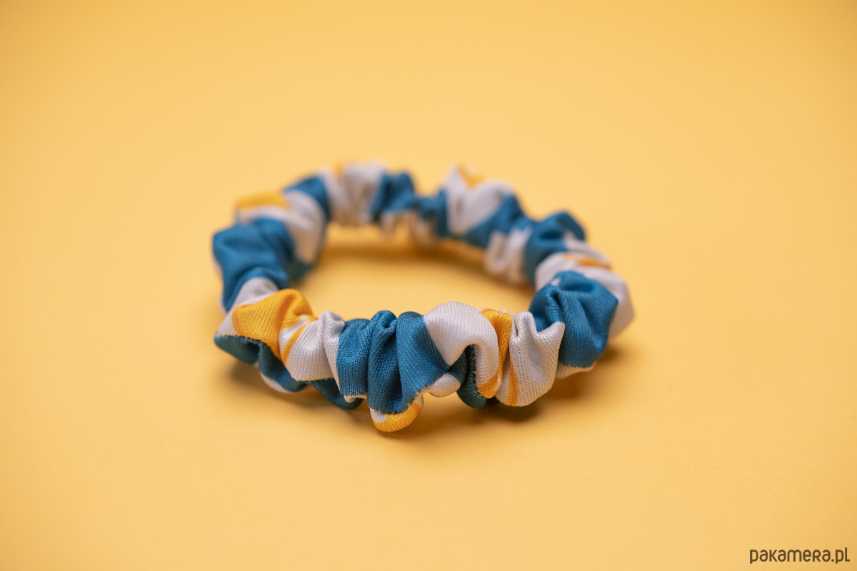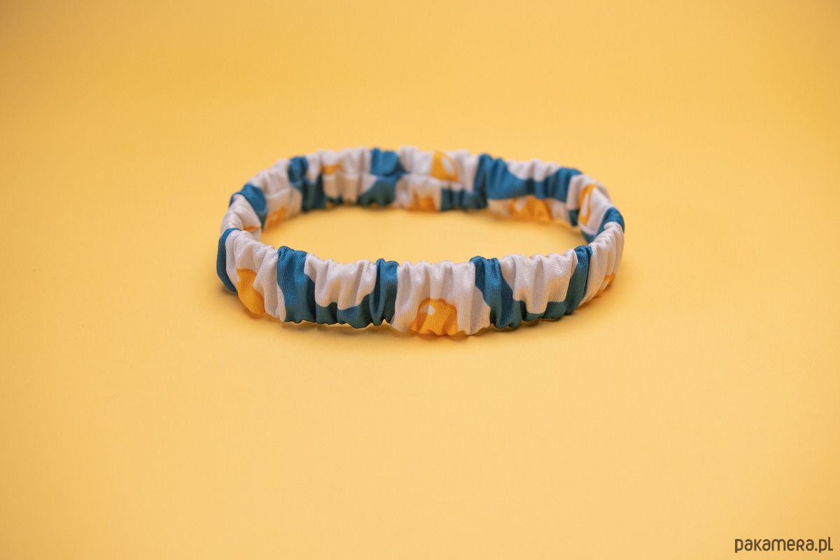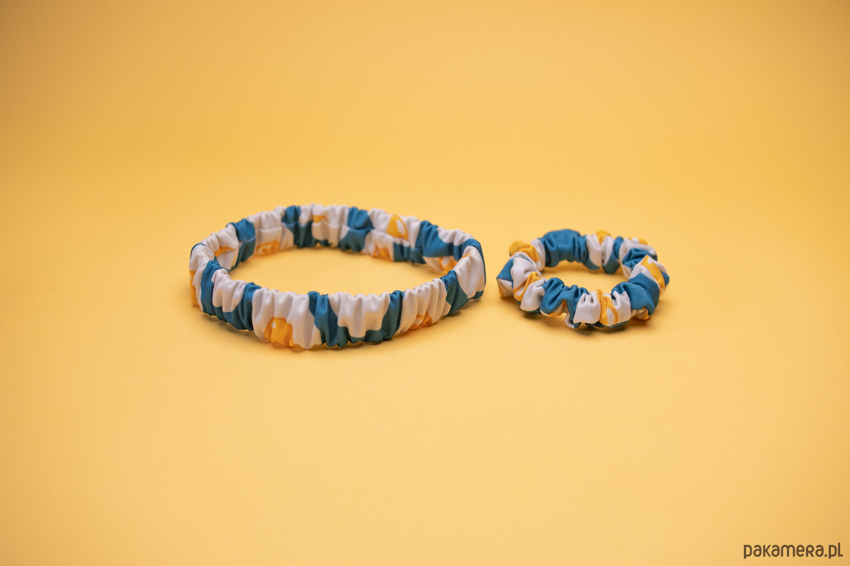 Wymiary: scrunchie - szerokość ~ 2 cm, średnica ~ 8 cm, opaska - szerokość ~ 2,5 cm, średnica ~ 18 cm