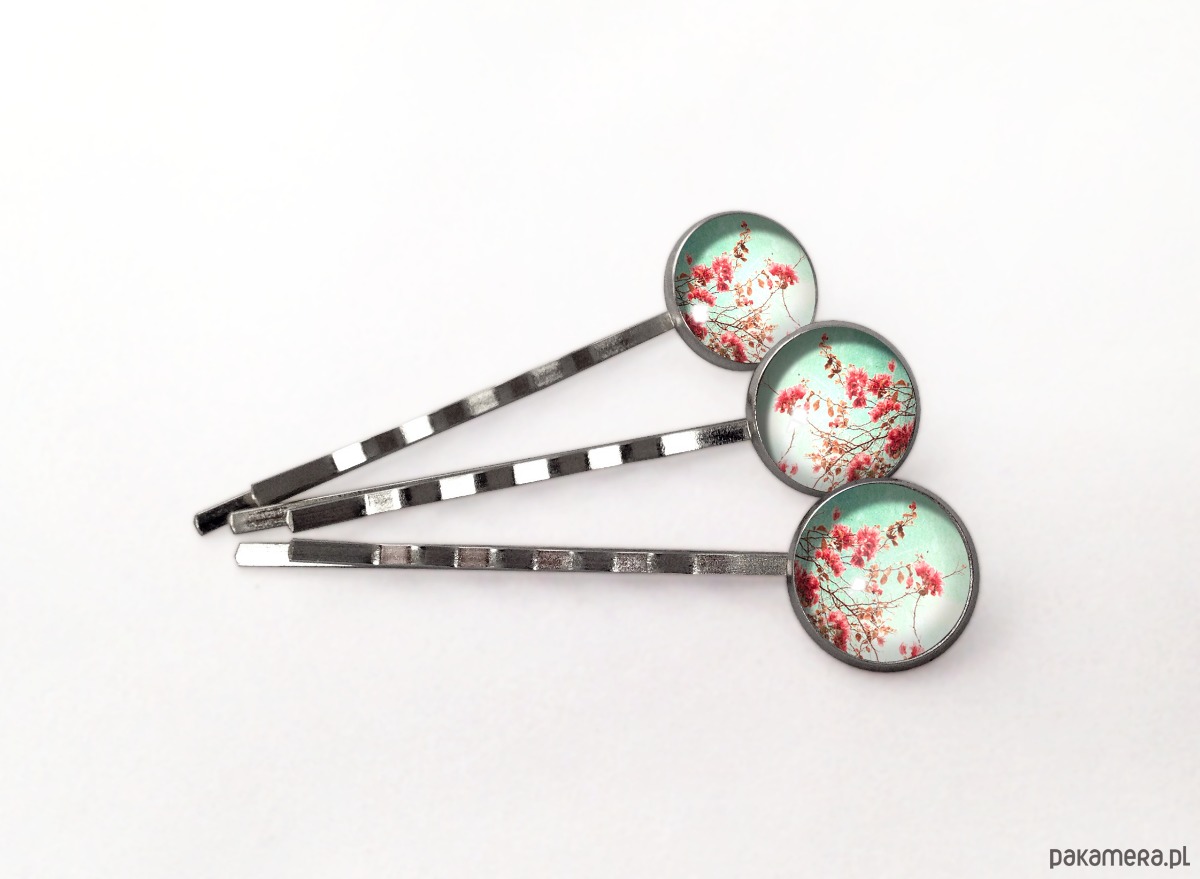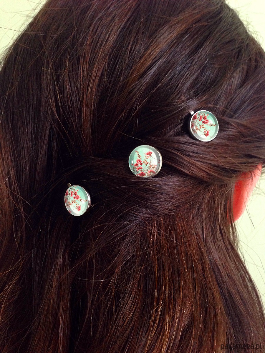 Komplet trzech ręcznie robionych wsuwek do włosów z wysokiej jakości grafiką pokrytą wypukłym, powiększającym szkiełkiem.