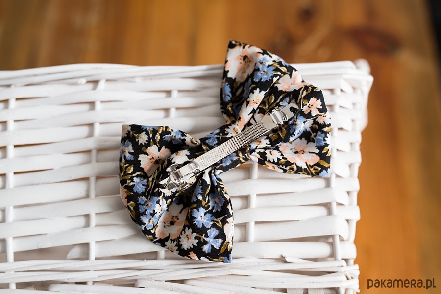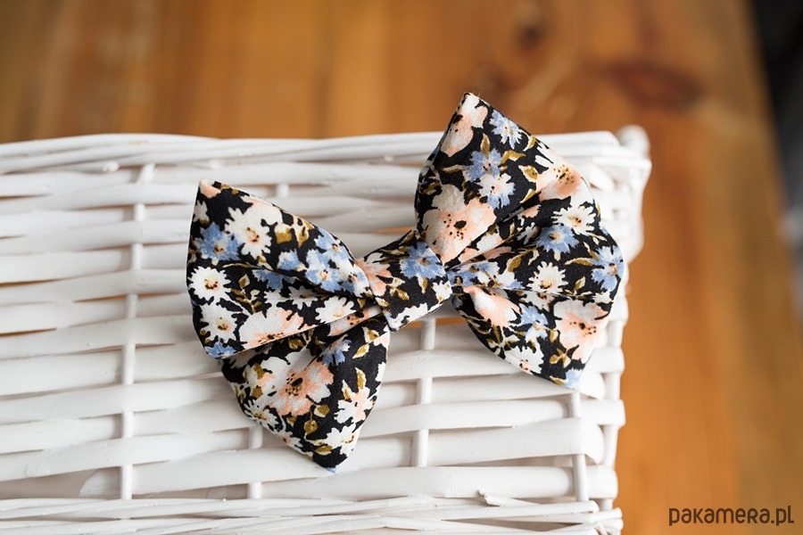 Ręcznie wykonana kokarda do włosów na spince automatycznej. Wymiary całej kokardy: 7 cm x 10,5 cm. Kolor: w kwiaty.