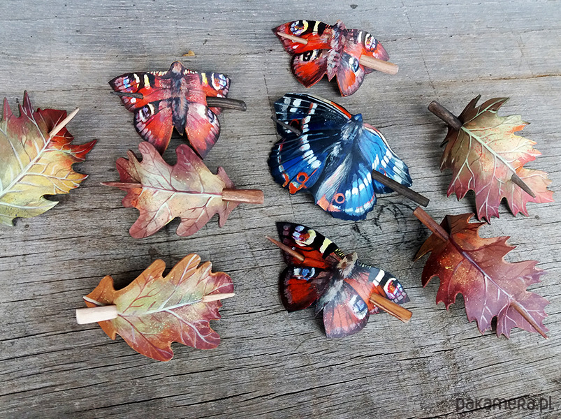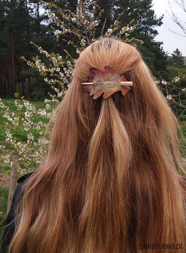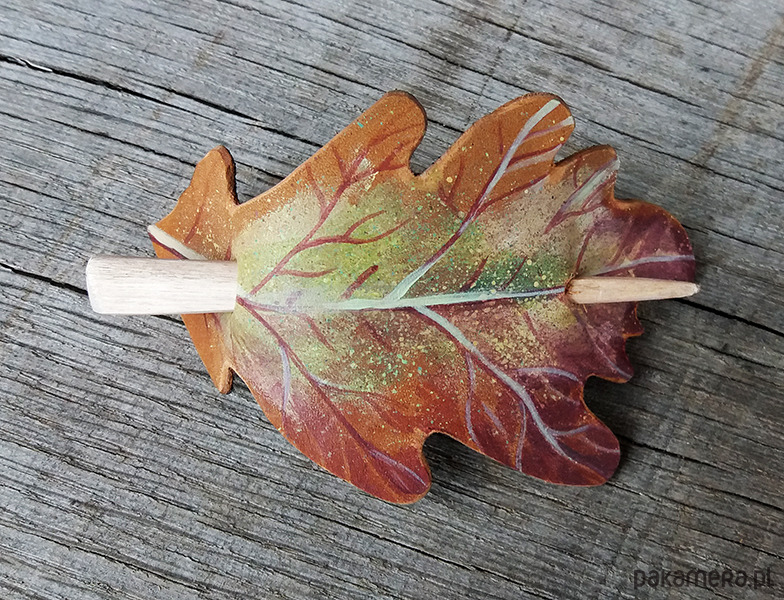 Użyłam w 100% naturalnych materiałów (skóra i drewno sosnowe) co powoduje że spinka się nie zniszczy, ale z czasem postarzeje co nada jej dodatkowej urody i oryginalności.