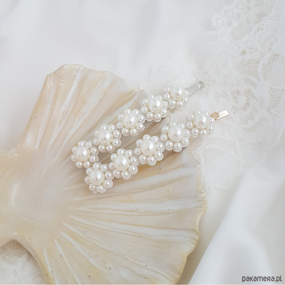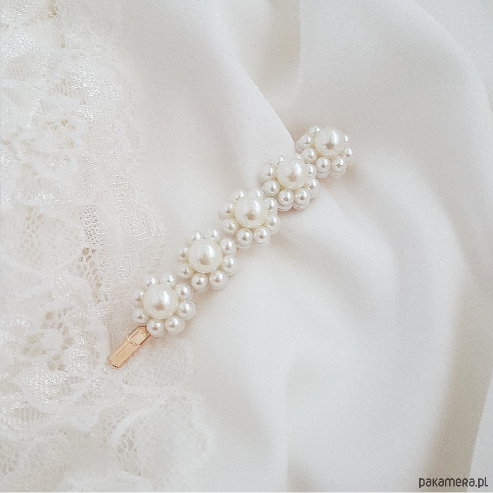 Klasyczna podłużna wsuwka z białymi syntetycznymi perłami. Baza spinki w kolorze złotym zrobiona jest z wysokiej jakości metalu. Wsuwka jest wykonana bardzo starannie a na włosach prezentuje się bardzo efektownie.