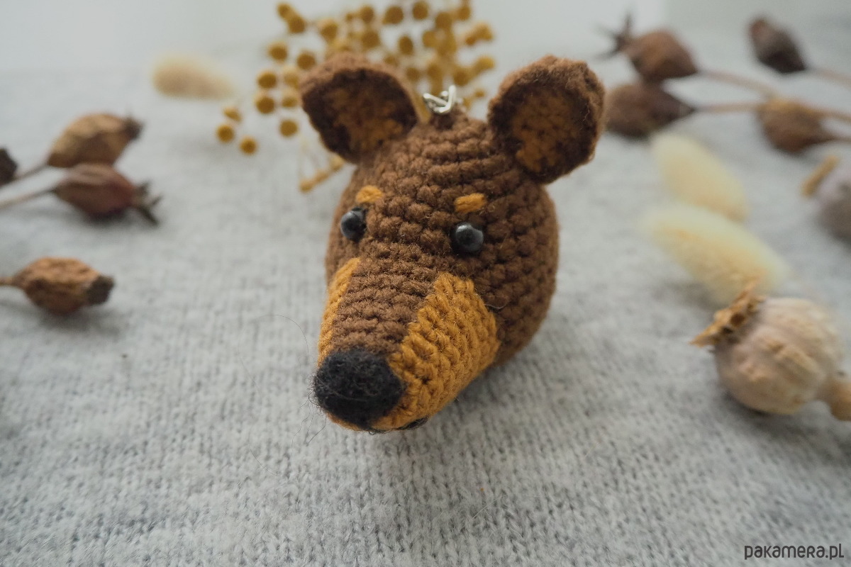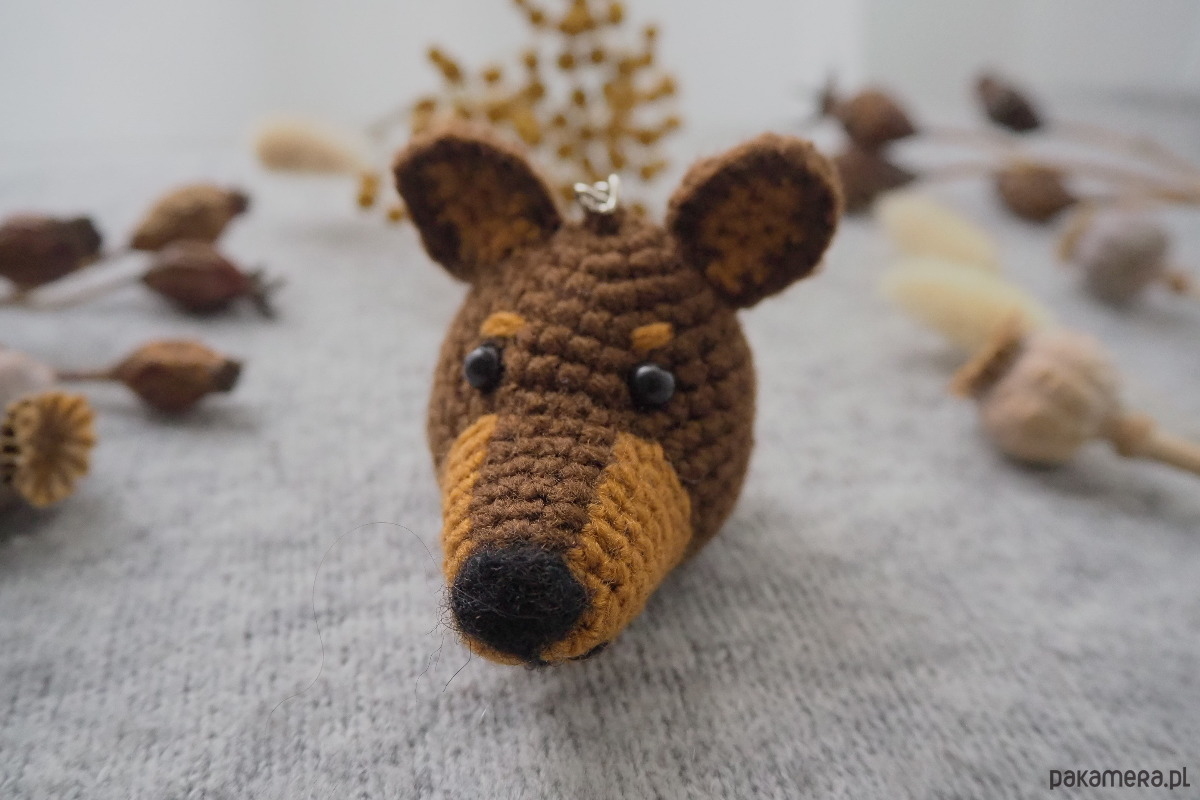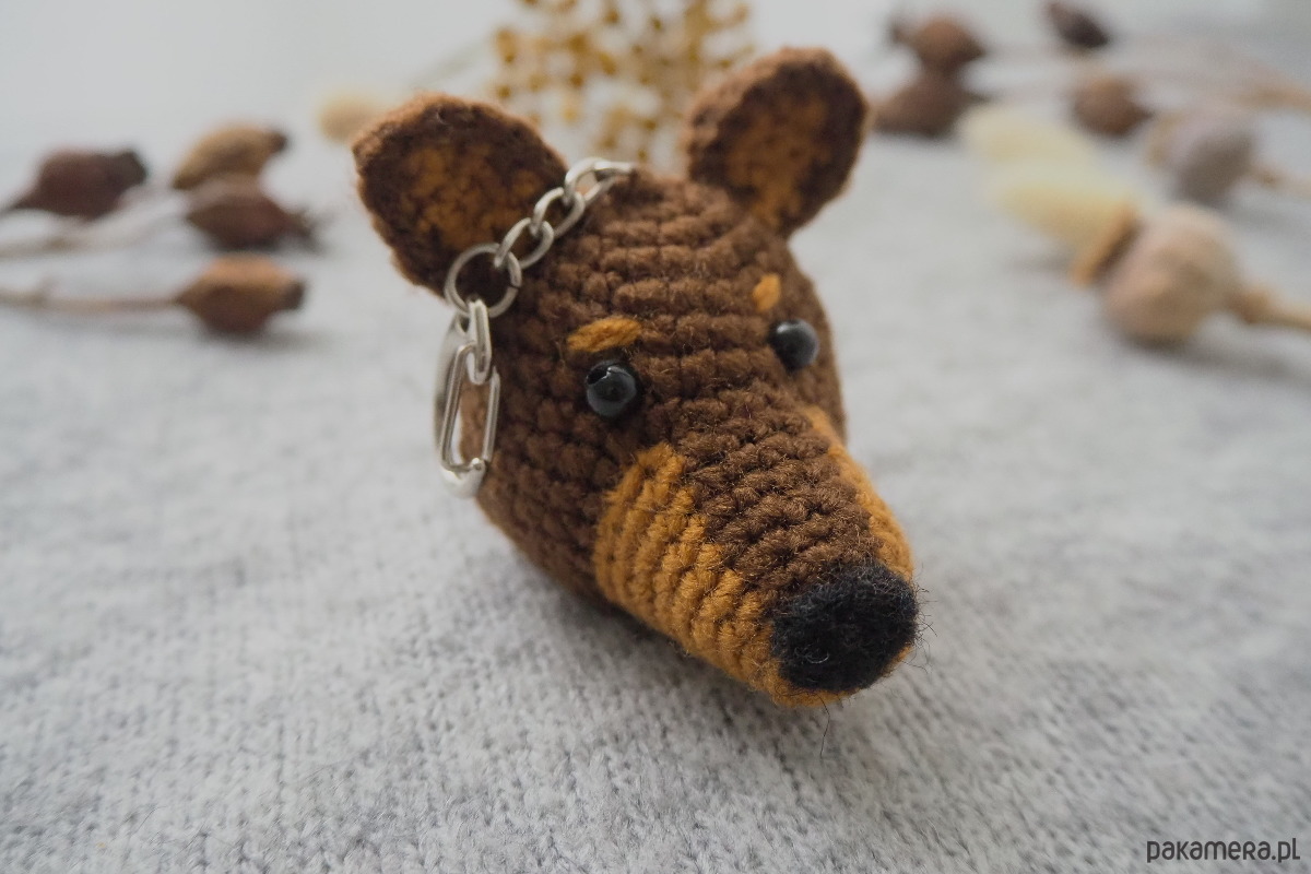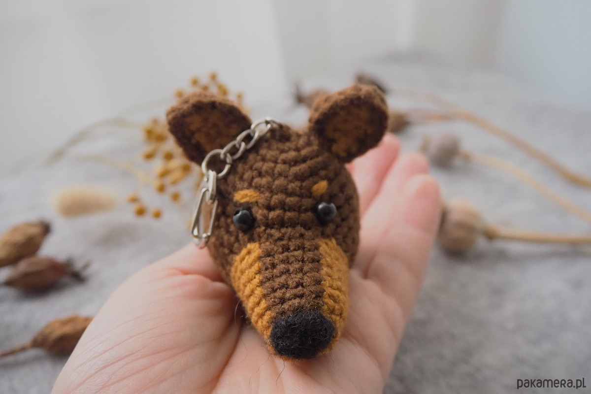 Sympatyczny brelok doberman wykonany ręcznie z włóczki na szydełku.
