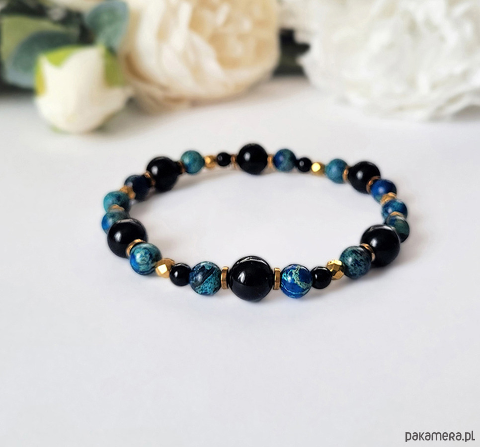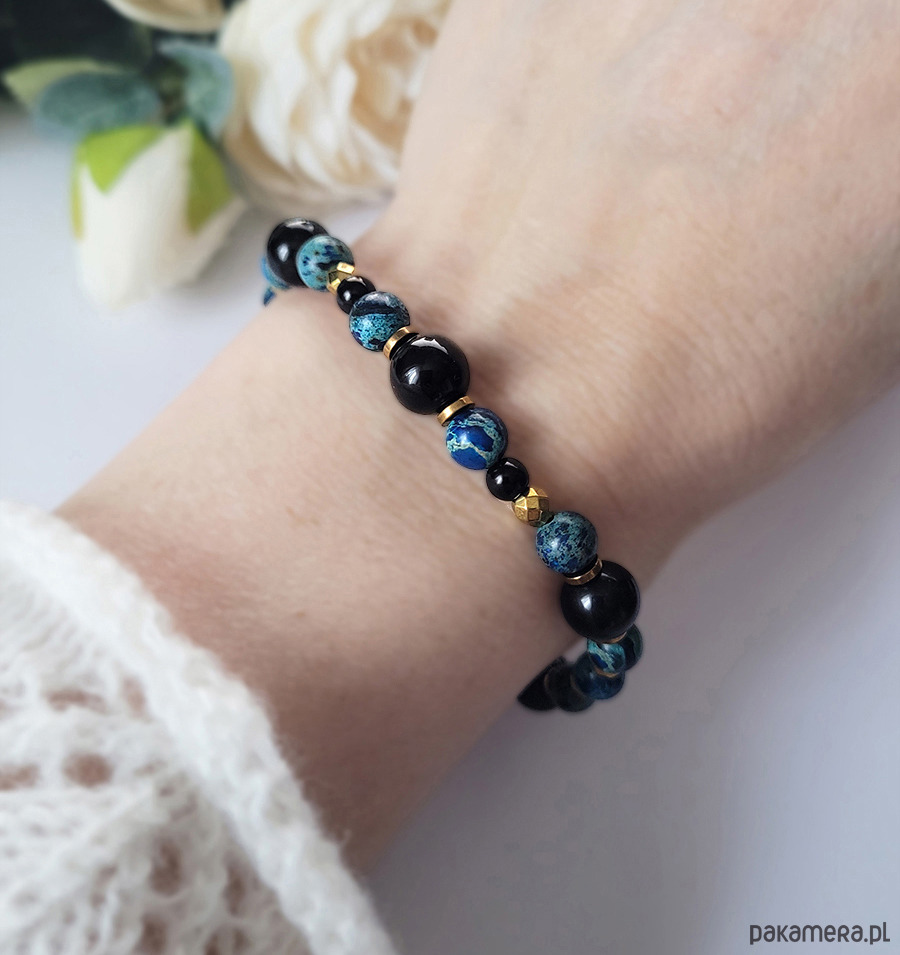 Piękna elegancka bransoletka zrobiona z kamieni naturalnych: Obsydianu, Jaspisu Cesarskiego- Niebieska Laguna oraz Hematytu w kolorze złota.