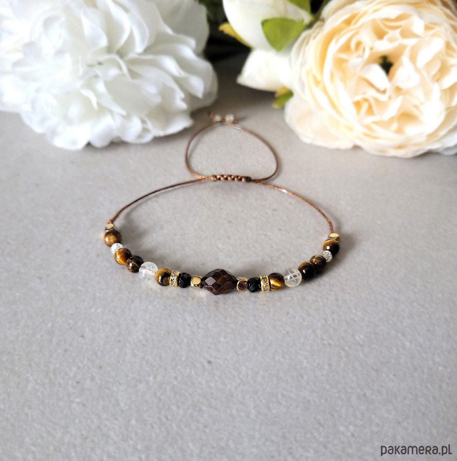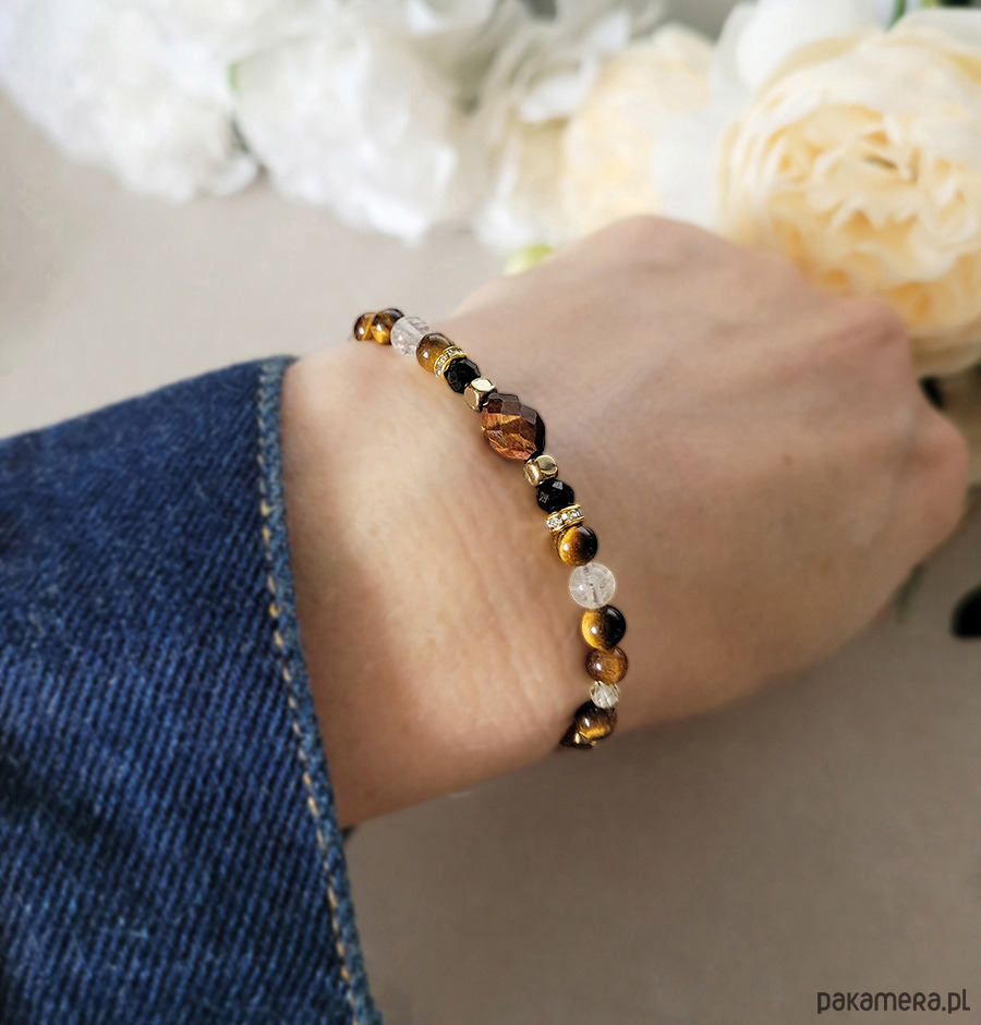 Przepiękna bransoletka zrobiona z kamieni naturalnych: Tygrysiego oka, Cytrynu, Turmalinu oraz Hematytu w kolorze złota oraz Cyrkonii.