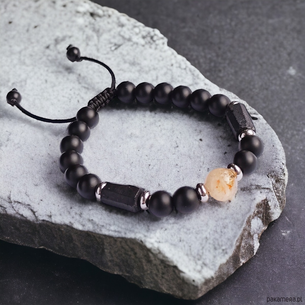 TUTAJ: prosta i stylowa bransoletka - wykonana z kul matowego ONYKSU 8mm, z dodatkiem 2 surowych bryłek czarnego turmalinu, przekładek ze stali szlachetnej (antyalergiczne, trwały kolor) oraz kuli cytrynu 10mm (w centrum).
