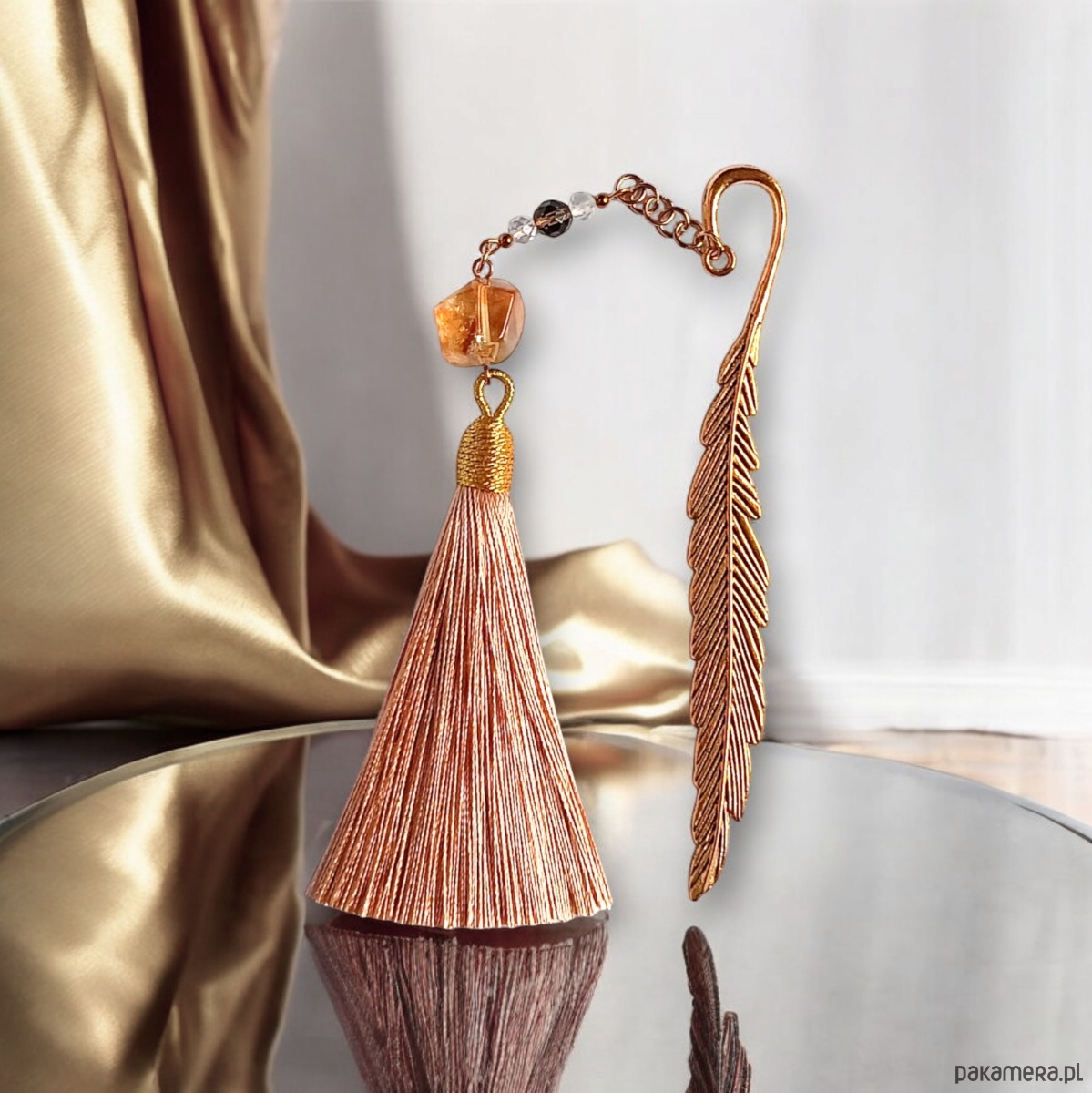 Duża, nieregularna bryłka cytrynu, fasetowane kuleczki kryształu górskiego i kwarcu dymnego, okazały chwost w kolorze beżowym, baza zakładki - metal w kolorze złota. pozostałe elementy metalowe wykonane z pozłacanej stali szlachetnej. wszystkie poszczególne elementy są ruchome, więc zakładka będzie się ładnie układała. długość samej zakładki (bazy): ok.12cm. .. dł. całego elementu wiszącego: ok.17cm.