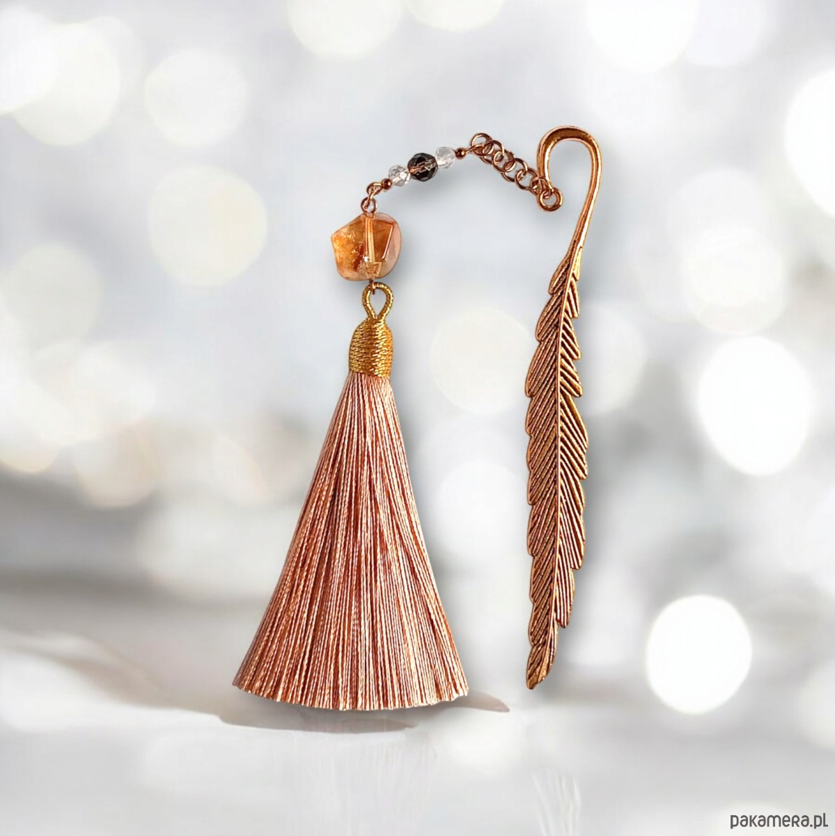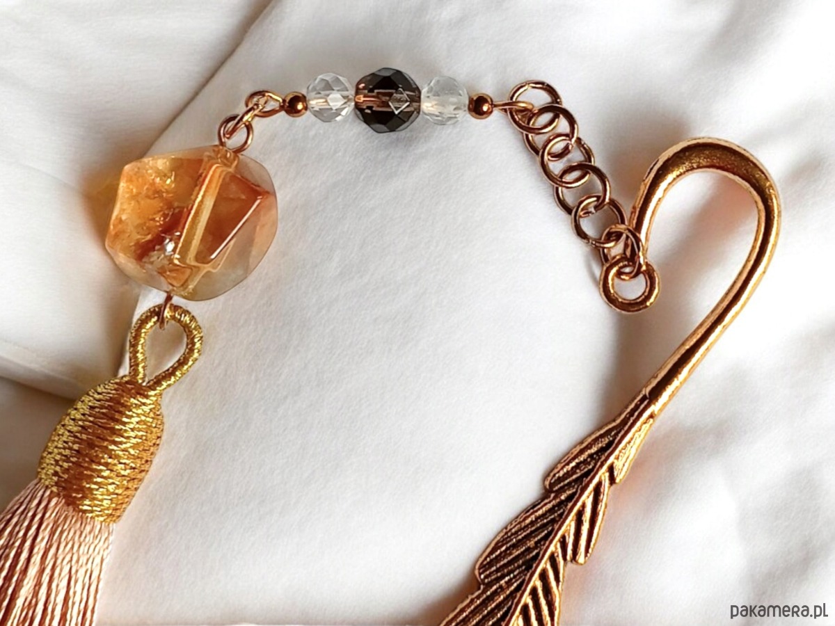 Duża, nieregularna bryłka cytrynu, fasetowane kuleczki kryształu górskiego i kwarcu dymnego, okazały chwost w kolorze beżowym, baza zakładki - metal w kolorze złota. pozostałe elementy metalowe wykonane z pozłacanej stali szlachetnej. wszystkie poszczególne elementy są ruchome, więc zakładka będzie się ładnie układała. długość samej zakładki (bazy): ok.12cm. .. dł. całego elementu wiszącego: ok.17cm.