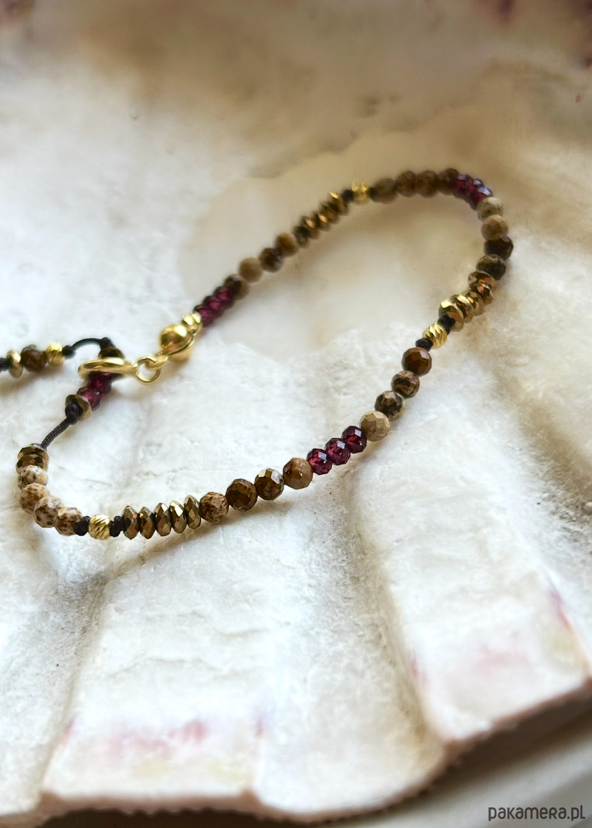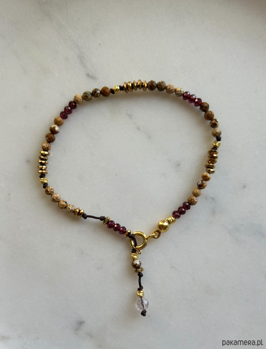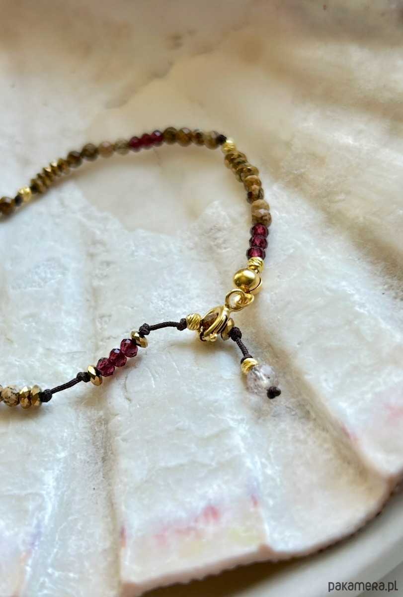 Granat wzmacnia pozytywne nastawienie do życia, przynosi dobrą energię, wzmacnia poczucie wewnętrznej harmonii. Aktywizuje nas do osiągnięcia dobrostanu, przyciąga obfitość. Na końcu kuleczka różowego kwarcu, który otwiera czakrę serca, pomaga w odczuwaniu bezwarunkowej miłości.
