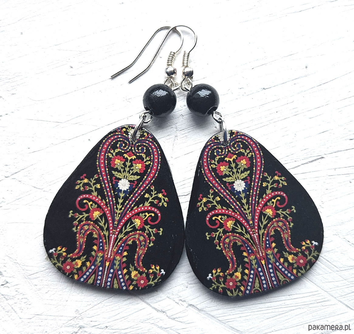kolczyki drewniane, ozdobione metodą decoupage, dwustronne, starannie wykończone farbami akrylowymi i zabezpieczone wielokrotnie lakierem, bigle posrebrzane, długość kolczyków bez bigli: 5,5 cm, szerokość: 3,5 cm, bardzo lekkie