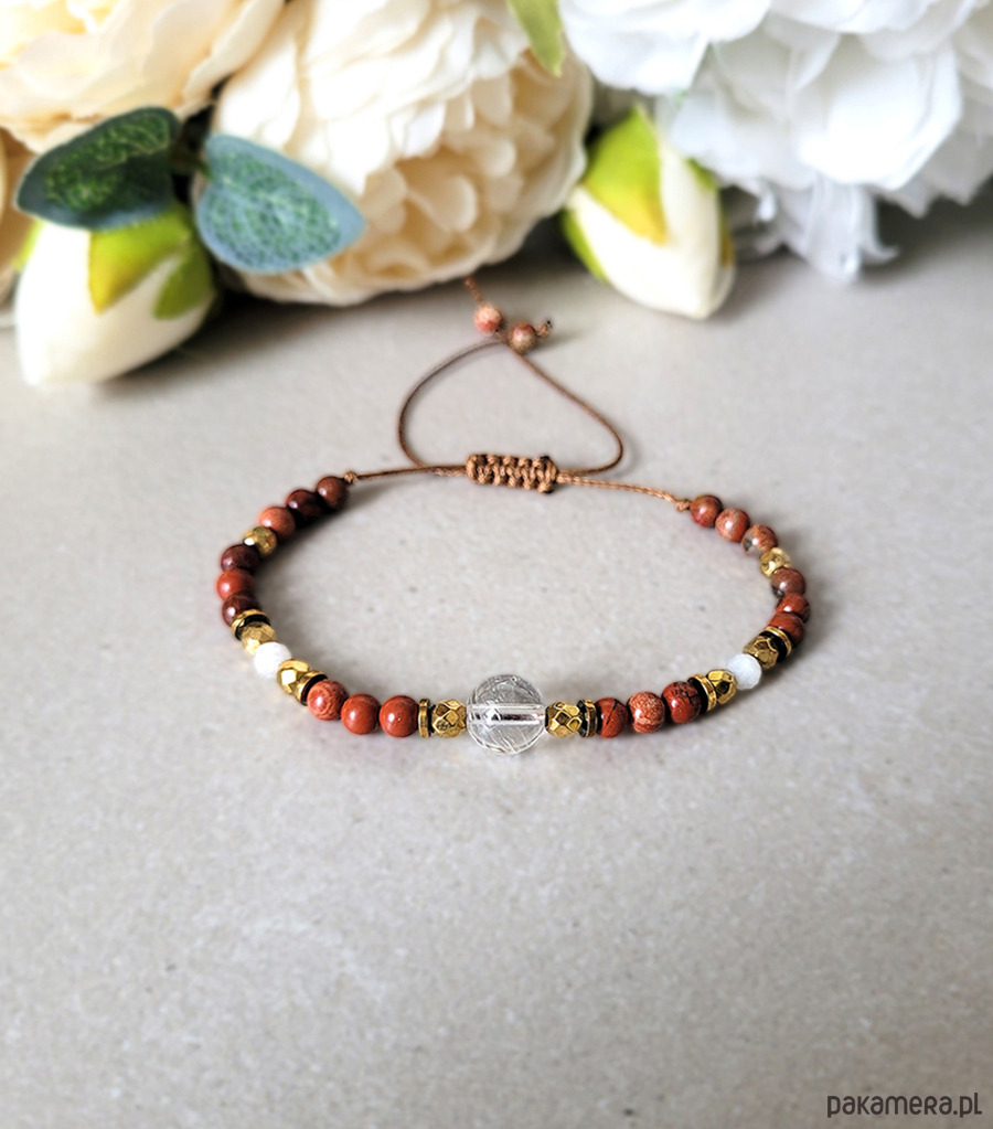 Piękna delikatna bransoletka na przemęczenie zrobiona z kamieni naturalnych: Kamienia księżycowego, Kryształu górskiego, Jaspisu czerwonego oraz Hematytu w kolorze złota.