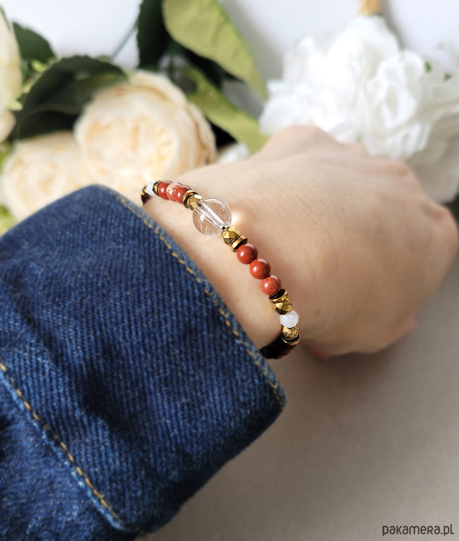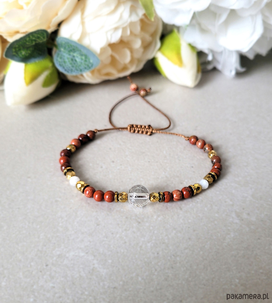 Piękna delikatna bransoletka na przemęczenie zrobiona z kamieni naturalnych: Kamienia księżycowego, Kryształu górskiego, Jaspisu czerwonego oraz Hematytu w kolorze złota.