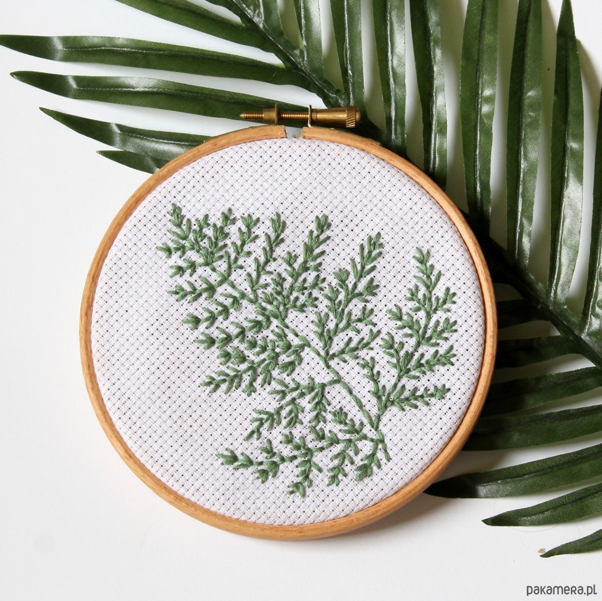 Minimalistyczny liść paproci w kolorze zielonym, wyhaftowany na białej kanwie.