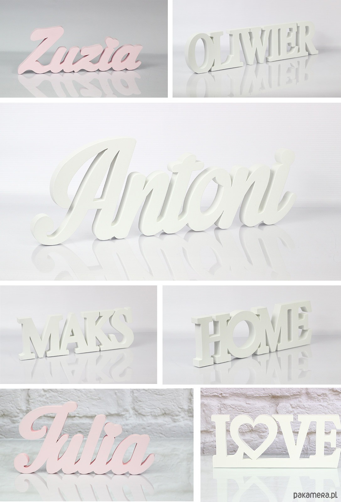 Samodzielnie stojące Imię wycięte z mdf. Pomalowane białą, różowa, czarną lub błękitną ekologiczną farbą akrylową.