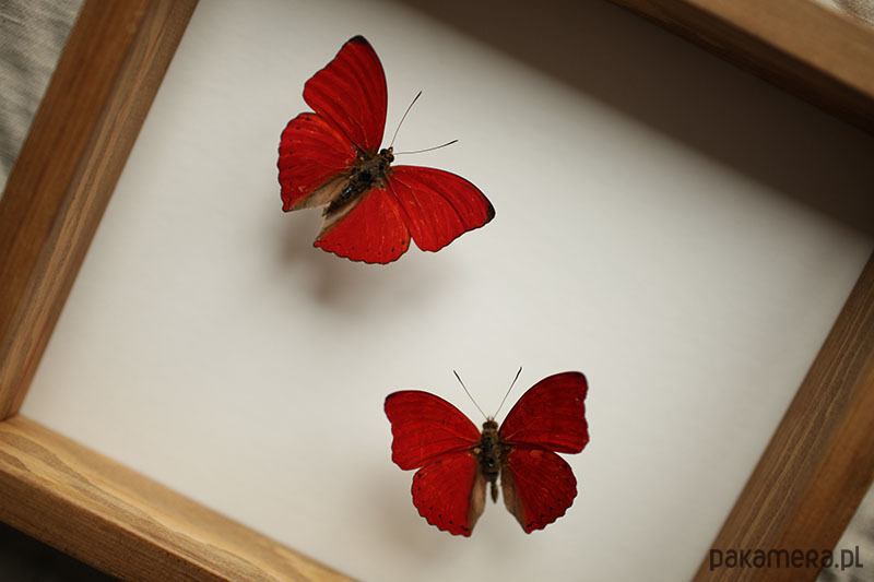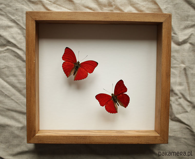 2 prawdziwe motyle - Cymothoe sangaris ułożone na białym tle w drewnianej gablocie.