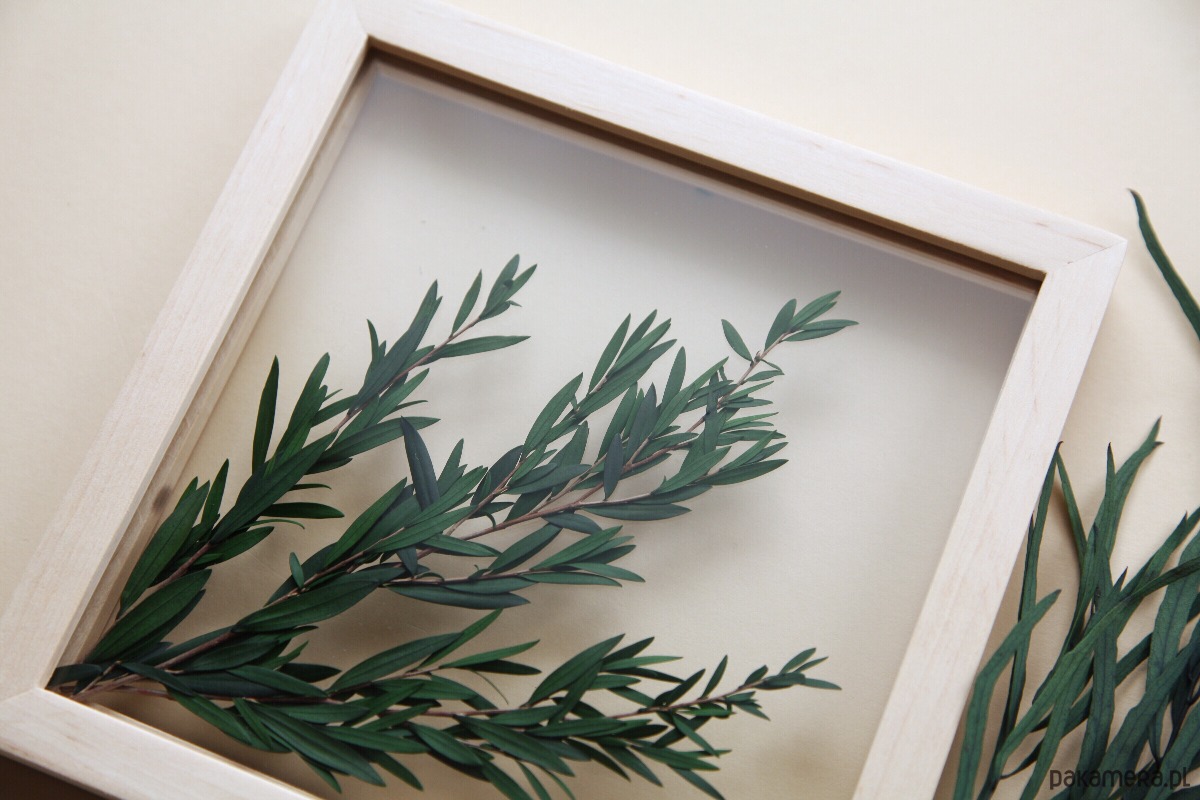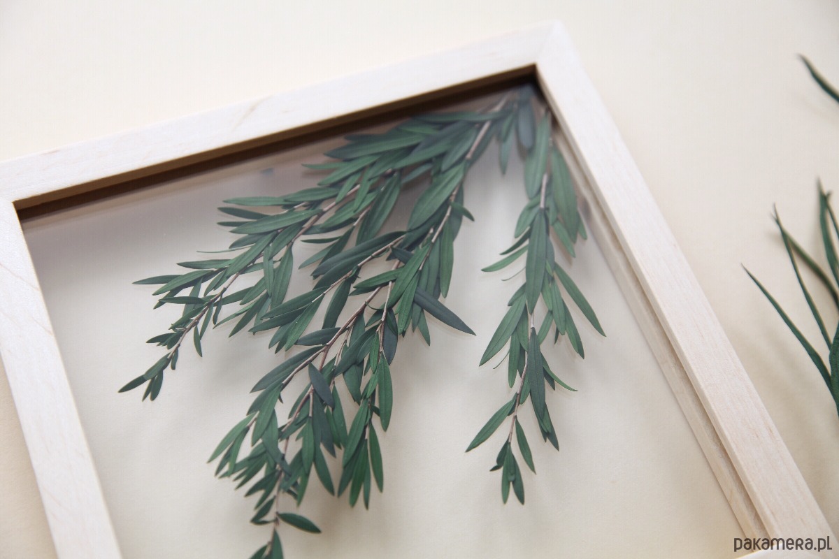 Stabilizowane* liście Lepto Longifolia w drewnianej ramce z podwójnym szkłem to minimalistyczny zielony dekor, nie wymajający żadnej opieki.