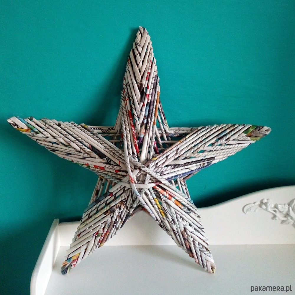 Sporych rozmiarów gwiazda wypleciona z szarych gazet. Zabezpieczona lakierem, trwała i wytrzymała. Jest przestrzenna, nie płaska :) Doskonała dekoracja domu w stylu eco i recyclart, nie tylko na święta.