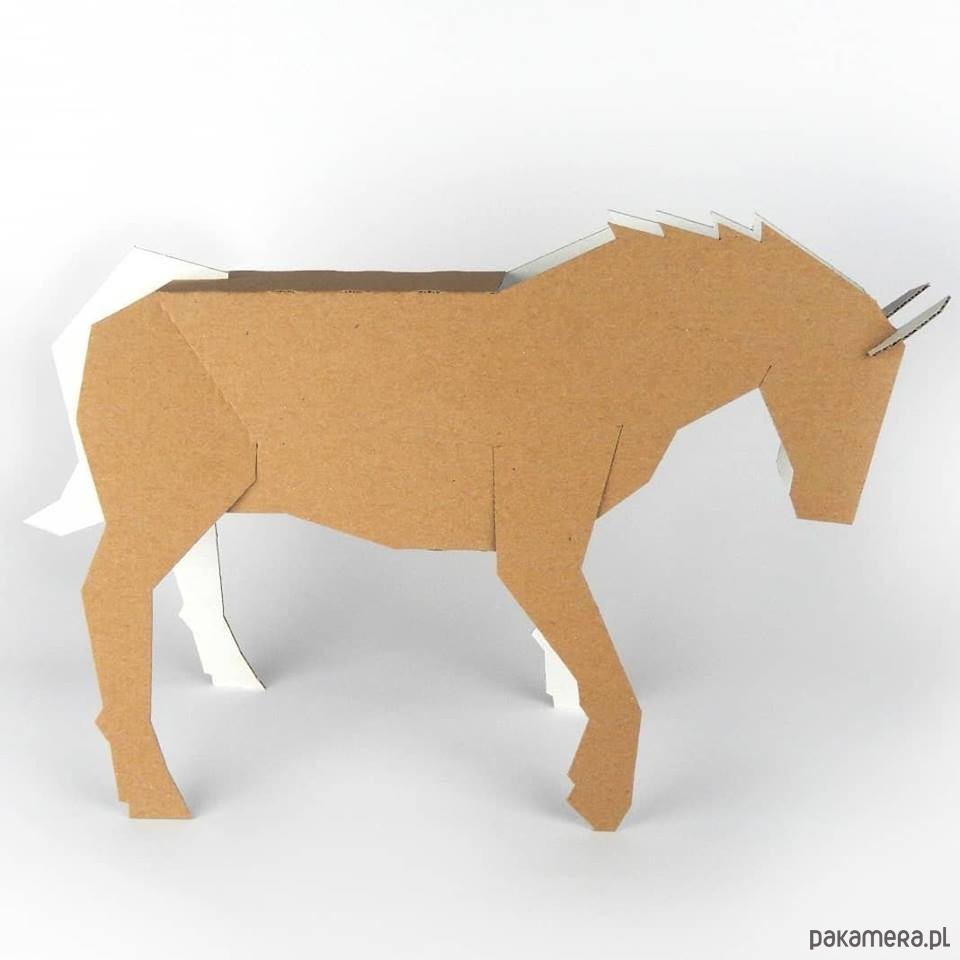 Koń to dekoracja wykonana z tektury falistej. Z prostych płaskich wykrojów powstają przestrzenne formy, które mogą stać się częścią wystroju wnętrza, a także zabawkami dla dziecka, zachęcającymi do kreatywnej aktywności i swobodnego dekorowania np. farbami.