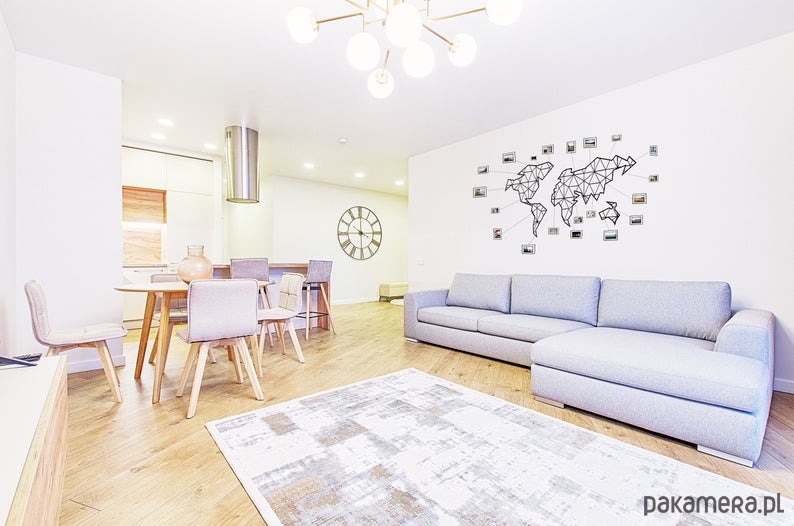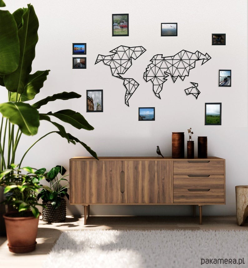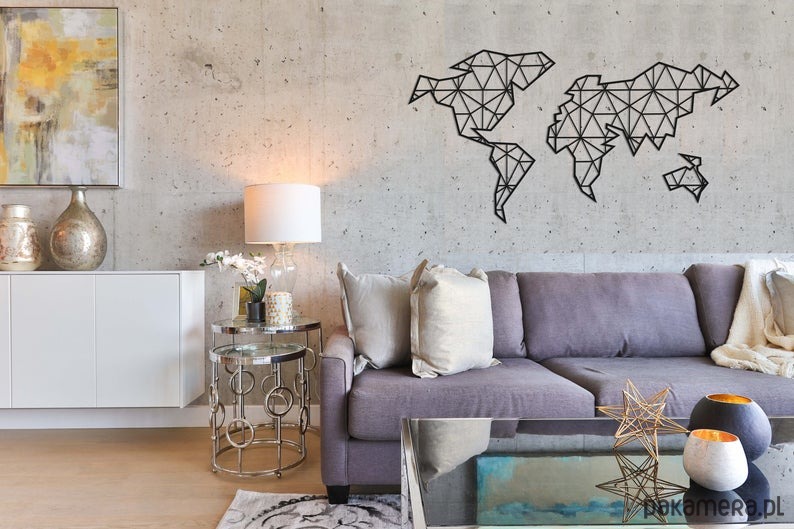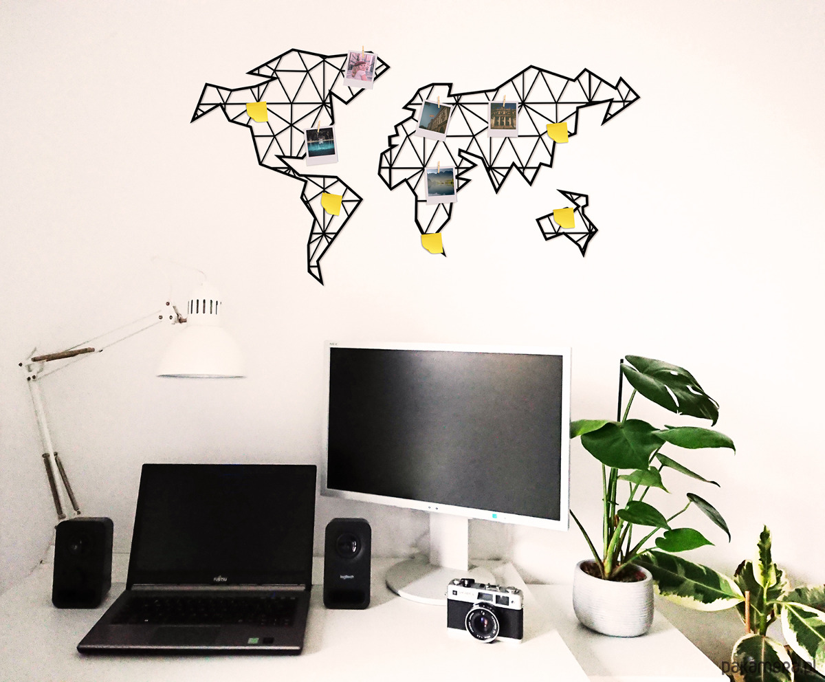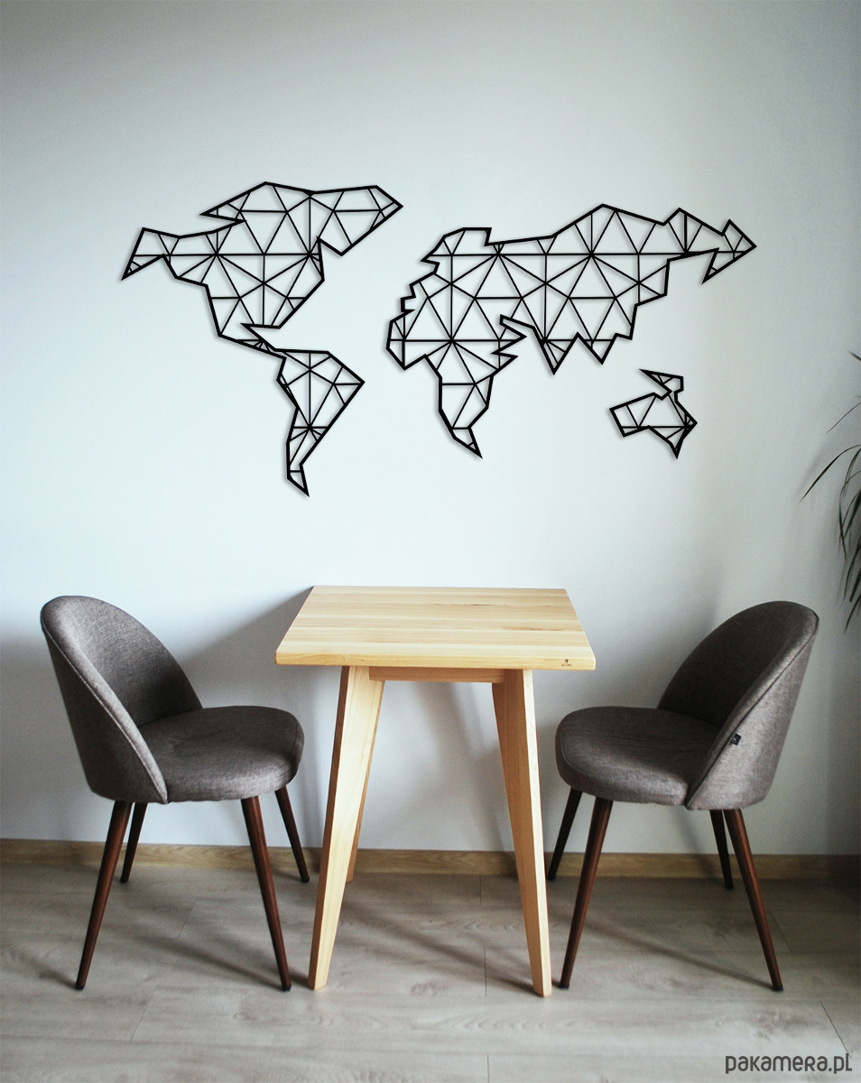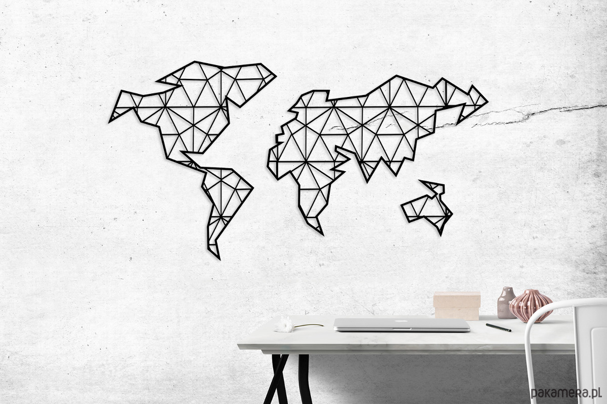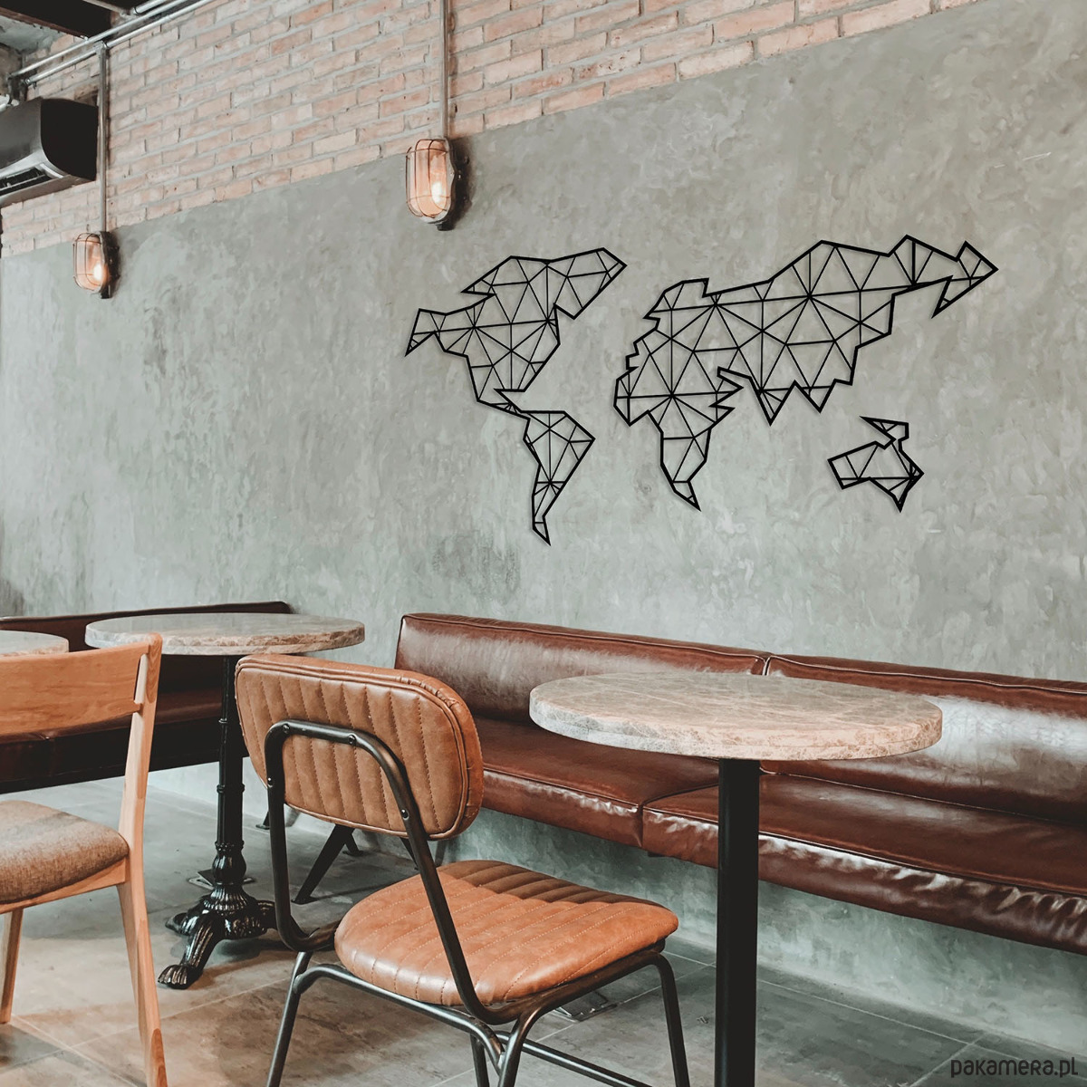 Metalowa dekoracja ścienna w postaci geometrycznej mapy świata, niesamowita dekoracja wnętrza miłośnika podróży, wnętrza biura czy lokalu gastronomicznego. Dekoracja w stu procentach została zaprojektowana przez naszych projektantów.