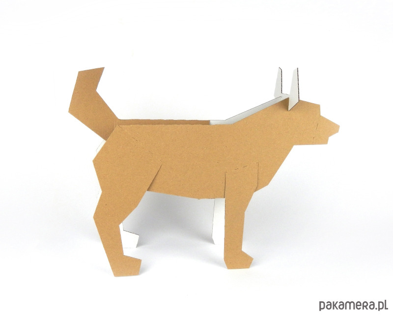 Wykonany jest z dwukolorowej tektury (jasnobrązowa warstwa z jednej strony i biała z drugiej). To od Ciebie zależy czy pies będzie brązowy czy biały.