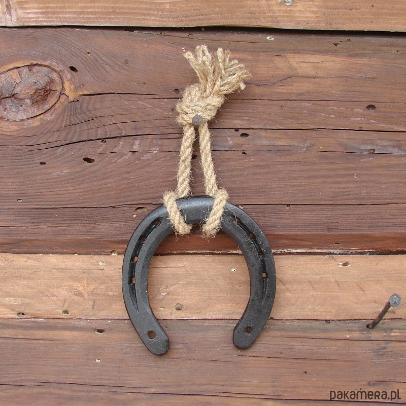stara podkowa zawieszona na sznurze konopnym, Super prezent na szczęście dla młodej pary, na parapetówkę,18-kę. Podkowa oczyszczona, zabezpieczona antykorozyjnie + powłoką zabezpieczającą.
