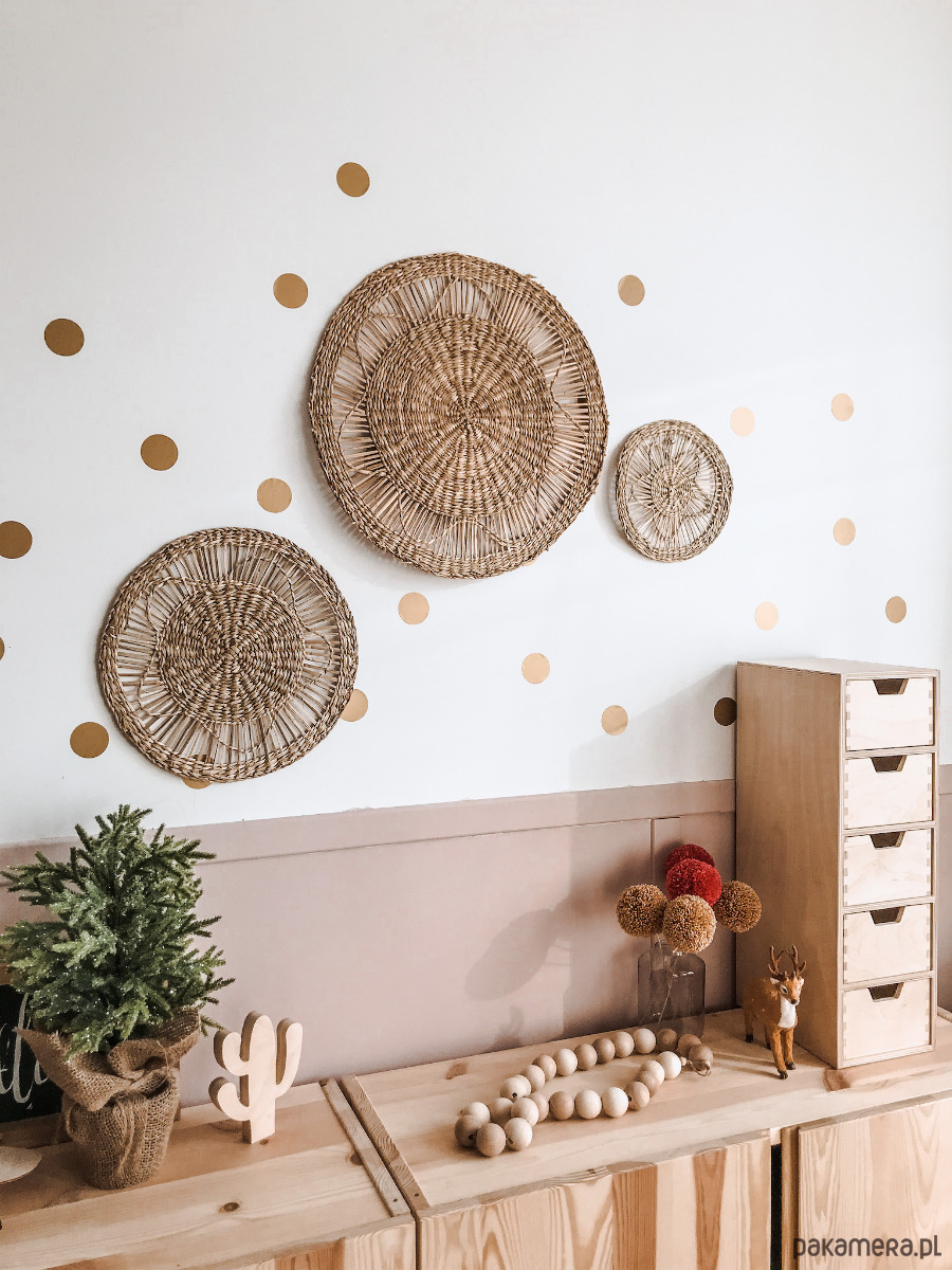 Nowoczesna ozdoba ścienna w postaci trzech wiklinowych kół , która zachwyci wielbicieli oryginalnych i niepowtarzalnych wnętrz.