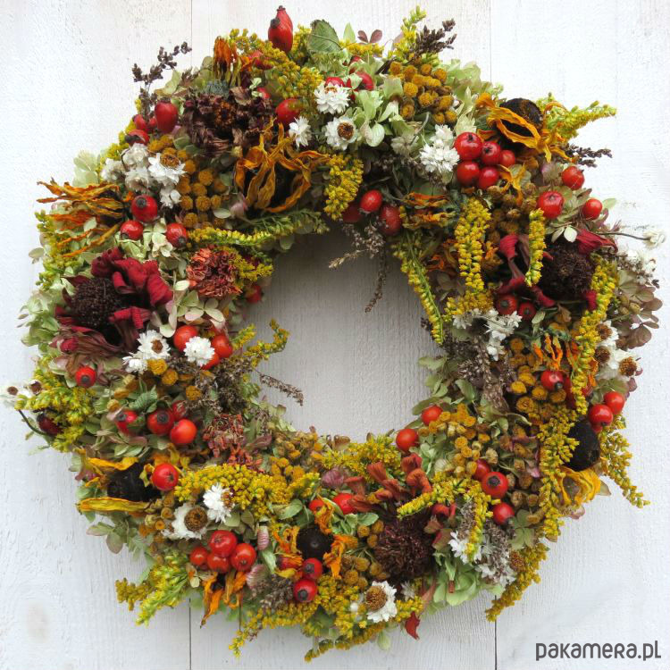 Duży, nastrojowy, całkowicie naturalny wianek wykonany na podstawie ze słomy o średnicy około 36 cm, gęsto udekorowany zasuszonymi kwiatami, owocami i ziołami wielu gatunków. Posiada zawieszkę ze sznurka.