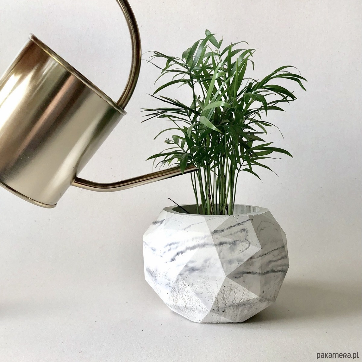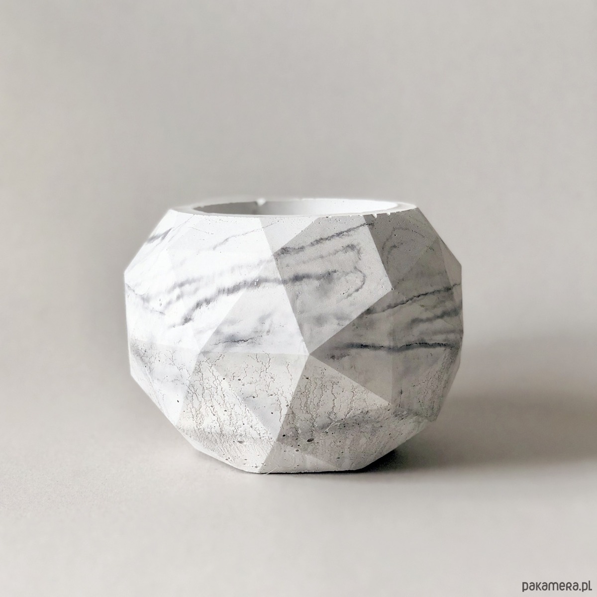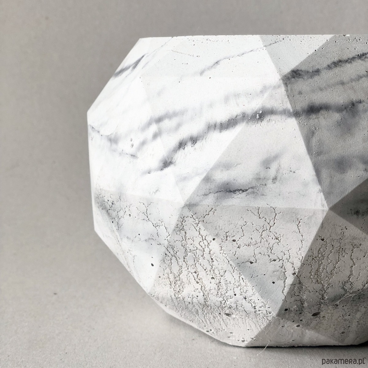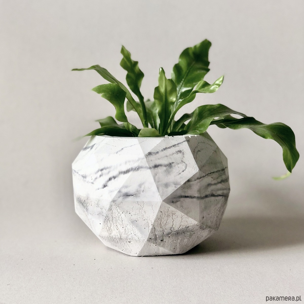 • Doniczka z białego betonu o efekcie marmuru, w kształcie wielościanu o wysokiej klasie wytrzymałości.
