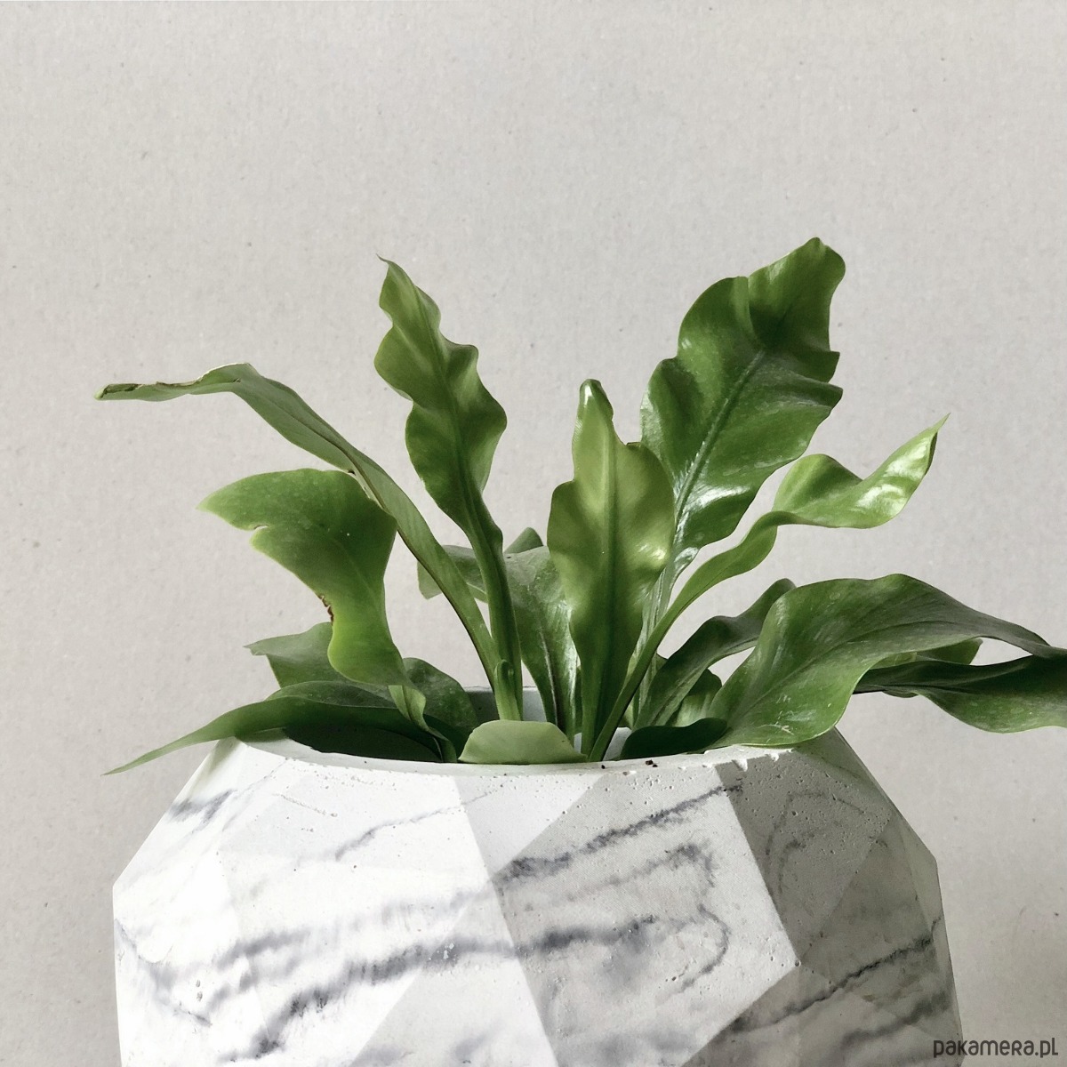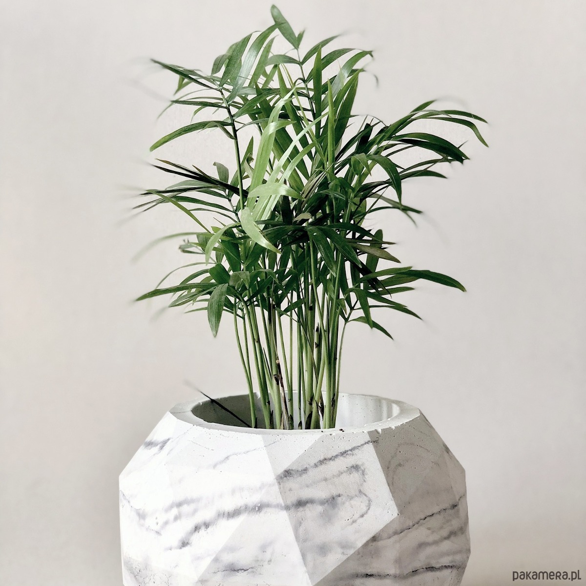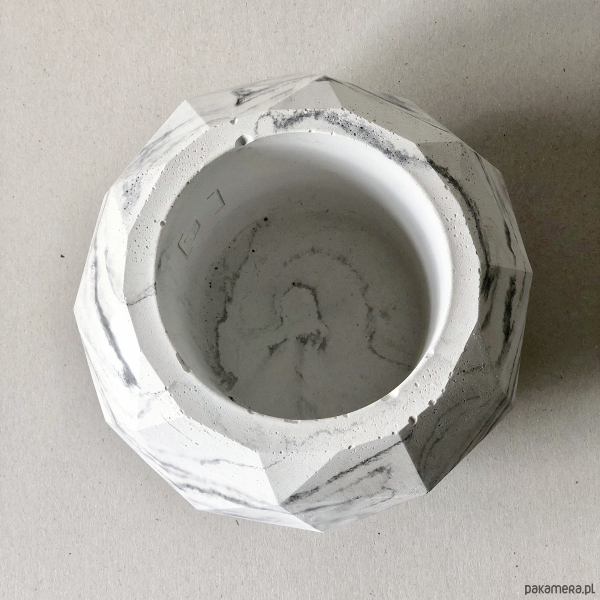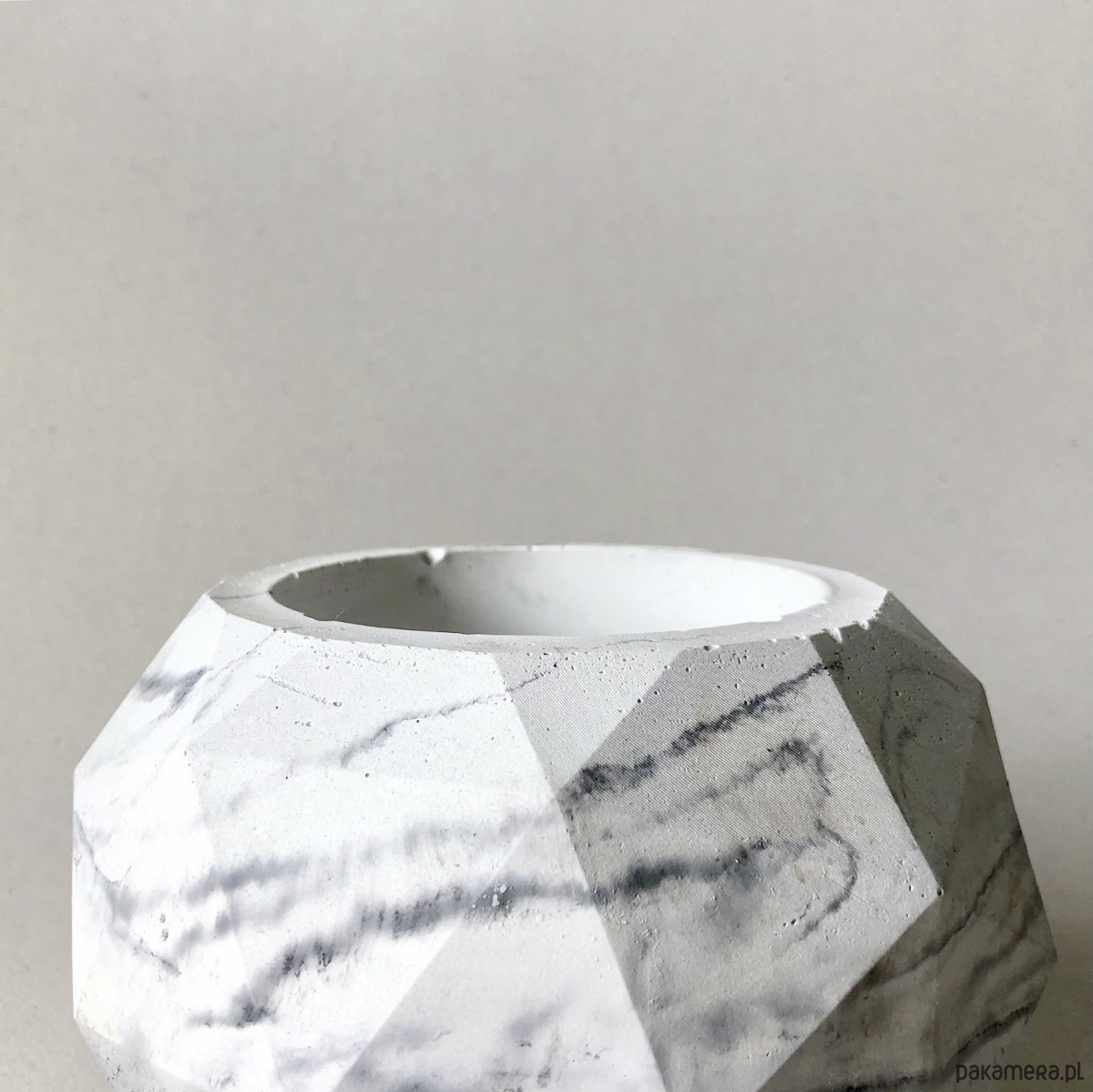 • Doniczka z białego betonu o efekcie marmuru, w kształcie wielościanu o wysokiej klasie wytrzymałości.