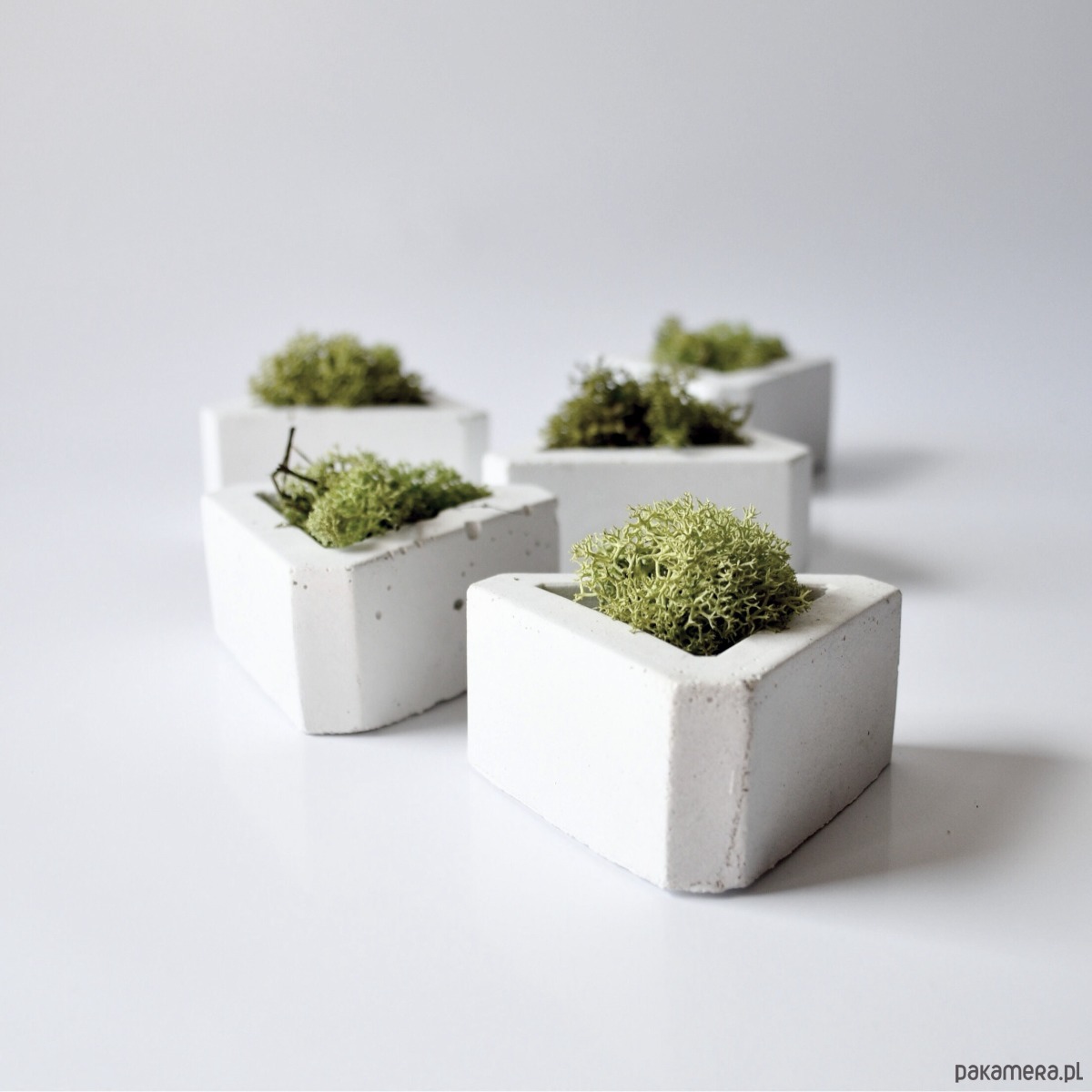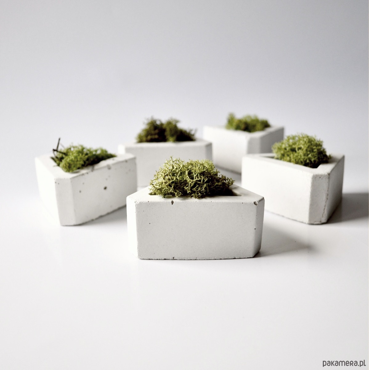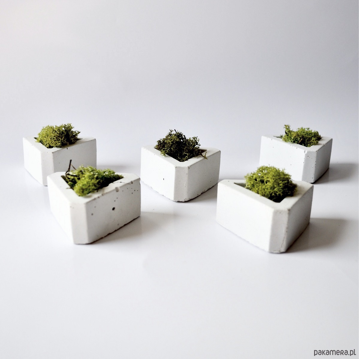• Doniczka w kształcie trójkąta z białego betonu o wysokiej klasie wytrzymałości.