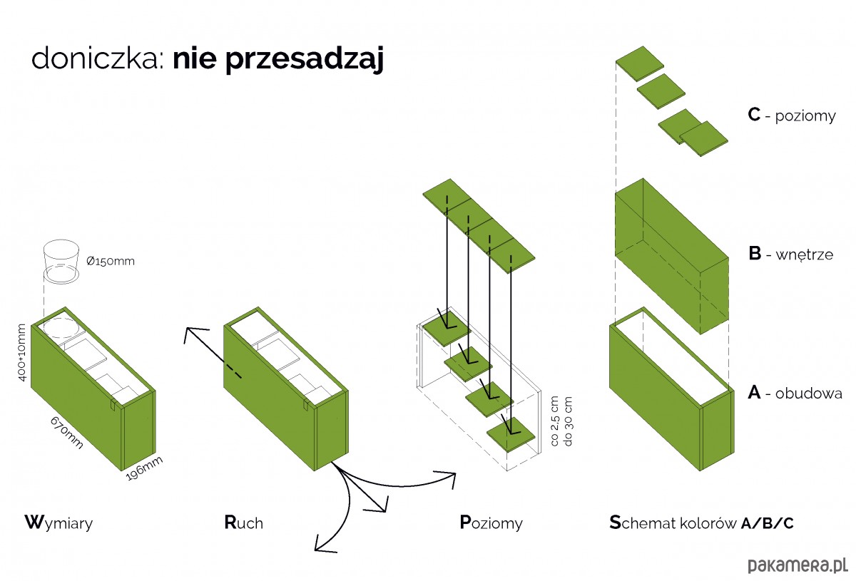 doniczka: „nie przesadzaj” (czarny/czarny/czarny). Pomysł – uporządkowanie zieleni (i nie tylko!) wewnątrz domu. „nie przesadzaj” bo nie chodzi o przesadzanie kwiatów tylko włożenie ich do środka w tym, w czym się znajdują. Ruch – całość jest na gumowych kółkach nie niszczących podłogi. Kółka są całkowicie zamaskowane – doniczka lewituje 1cm nad podłogą. Poziomy – każda wkładana doniczka prawdopodobnie ma różną wysokość, jednak prosty system „dziurek” pozwala na zawieszenie jej na dowolnym poziomie, co 2,5cm. Dlatego z łatwością postawicie obok doniczek nawet wazon z kwiatami o wysokości do 30cm! Lub – możecie wykorzystać doniczkę w każdy inny sposób – jako stolik, półkę na wino, prasę itp. Materiał – charakterystyczna struktura płyty OSB w zestawieniu z delikatnym detalem połączeń dała wyjątkowy efekt a dyskretna zawieszka z logo dopełnia całości. Kolor – opracowaliśmy prosty system doboru koloru, wg którego każda doniczka może mieć spersonalizowany wygląd. Podzieliliśmy całość na trzy części kolorystyczne A/B/C w których: A – to obudowa zewnętrzna doniczki; B – to wnętrze; C – to kolor podkładek poziomujących. Standardowe kolory to: naturalny (lakier), biały, szary oraz czarny. Wymiary – (długość/szerokość/wysokość) – 671/196/400mm. Podniesienie doniczki nad podłogę wynosi 10mm. Zalecana średnica jednej z 4 doniczek, które można włożyć do środka to 150mm (+ 5mm luzu do obudowy).