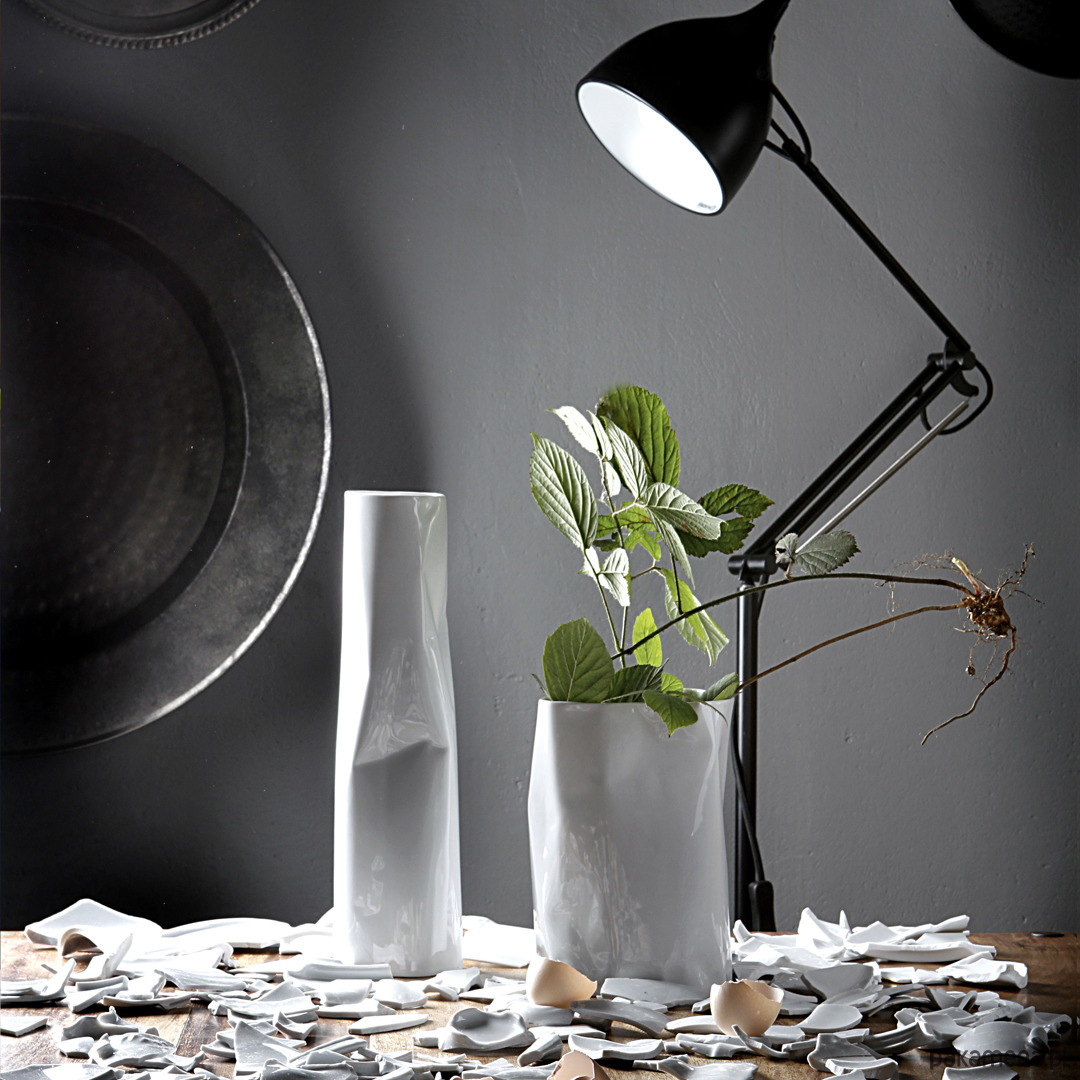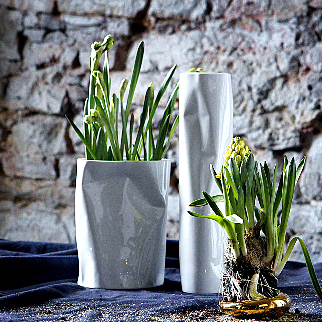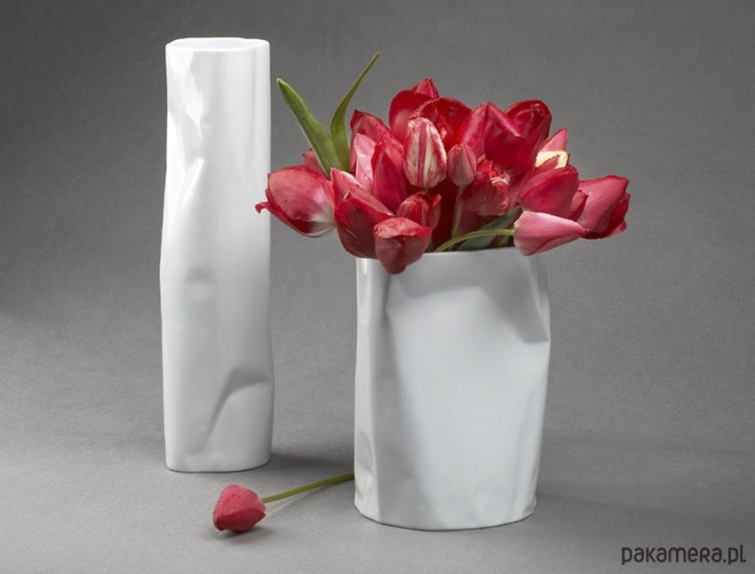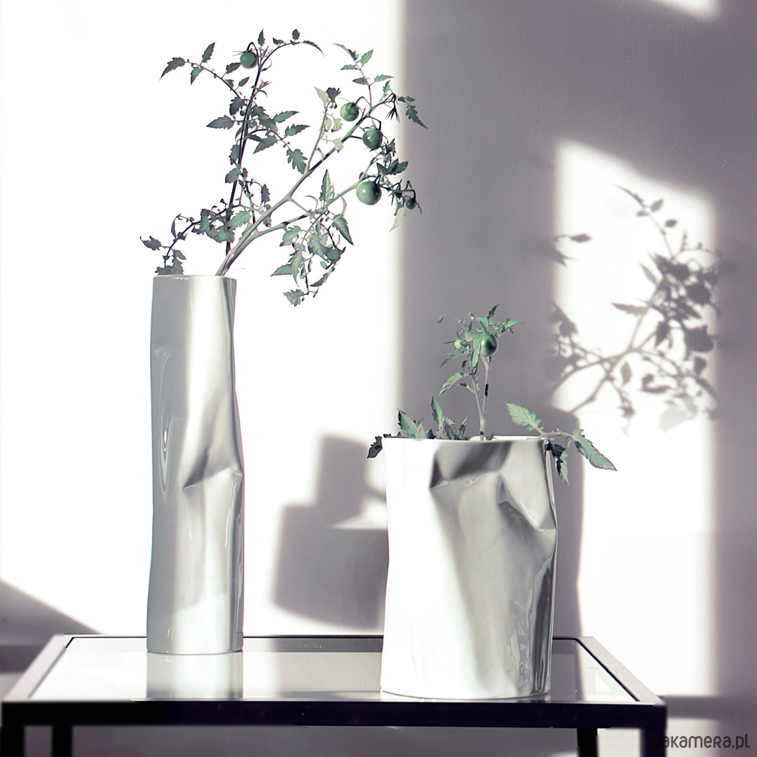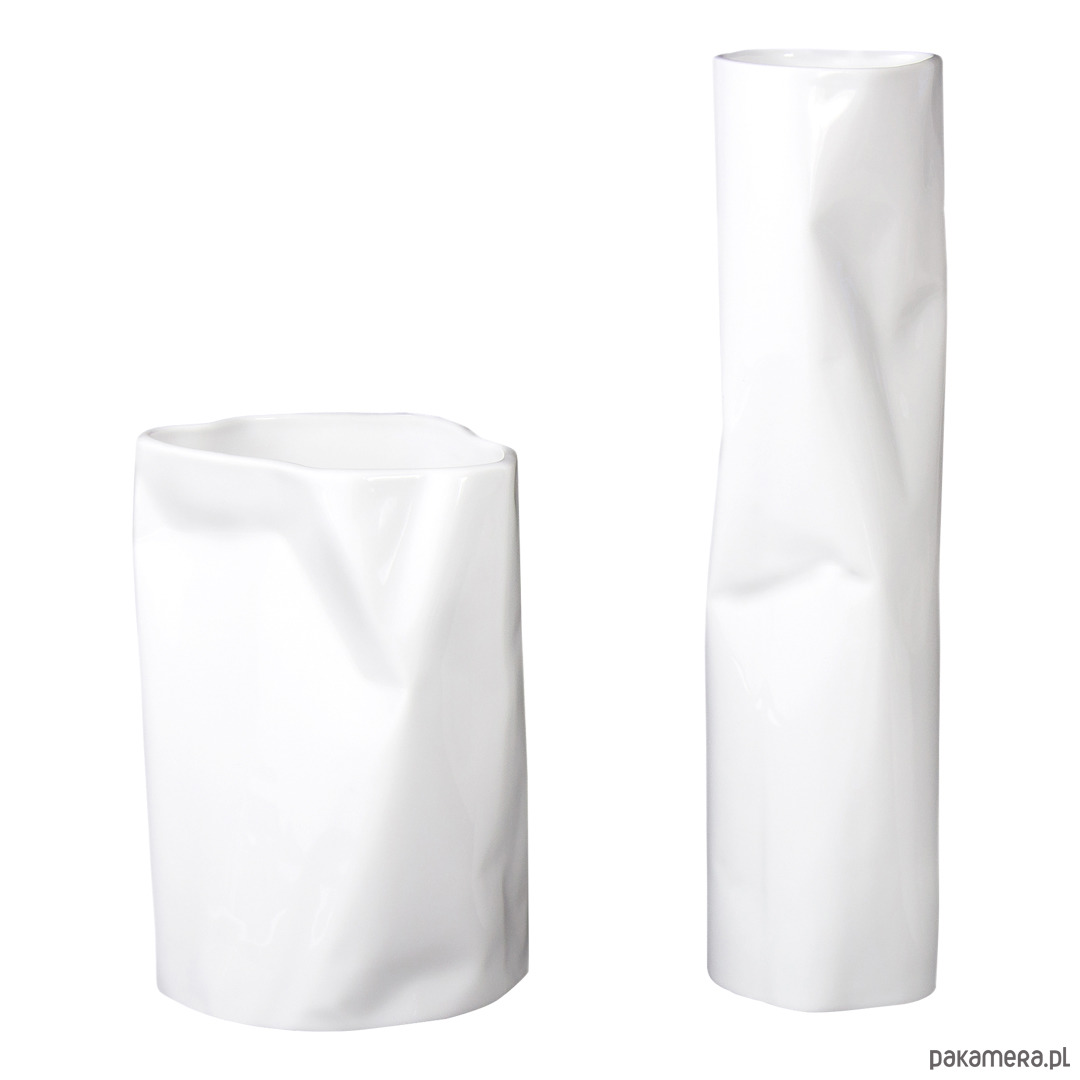 Wazony Pogięte to projekt Modus Design, włączony do kolekcji Ćmielów Design Studio w 2013 r. Nieskazitelnie biała porcelana tej serii przypomina pogiętą blachę lub zmięty papier. Po dopełnieniu kwiatami, zmieni się charakter tych obiektów: zniknie surowość, a powstaną niepowtarzalne, przyciągające uwagę kompozycje. Wazon występuje w wersji wysokiej i niskiej, można je aranżować indywidualnie lub jako komplet.
