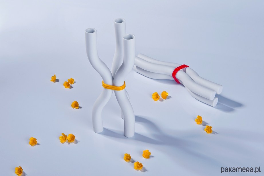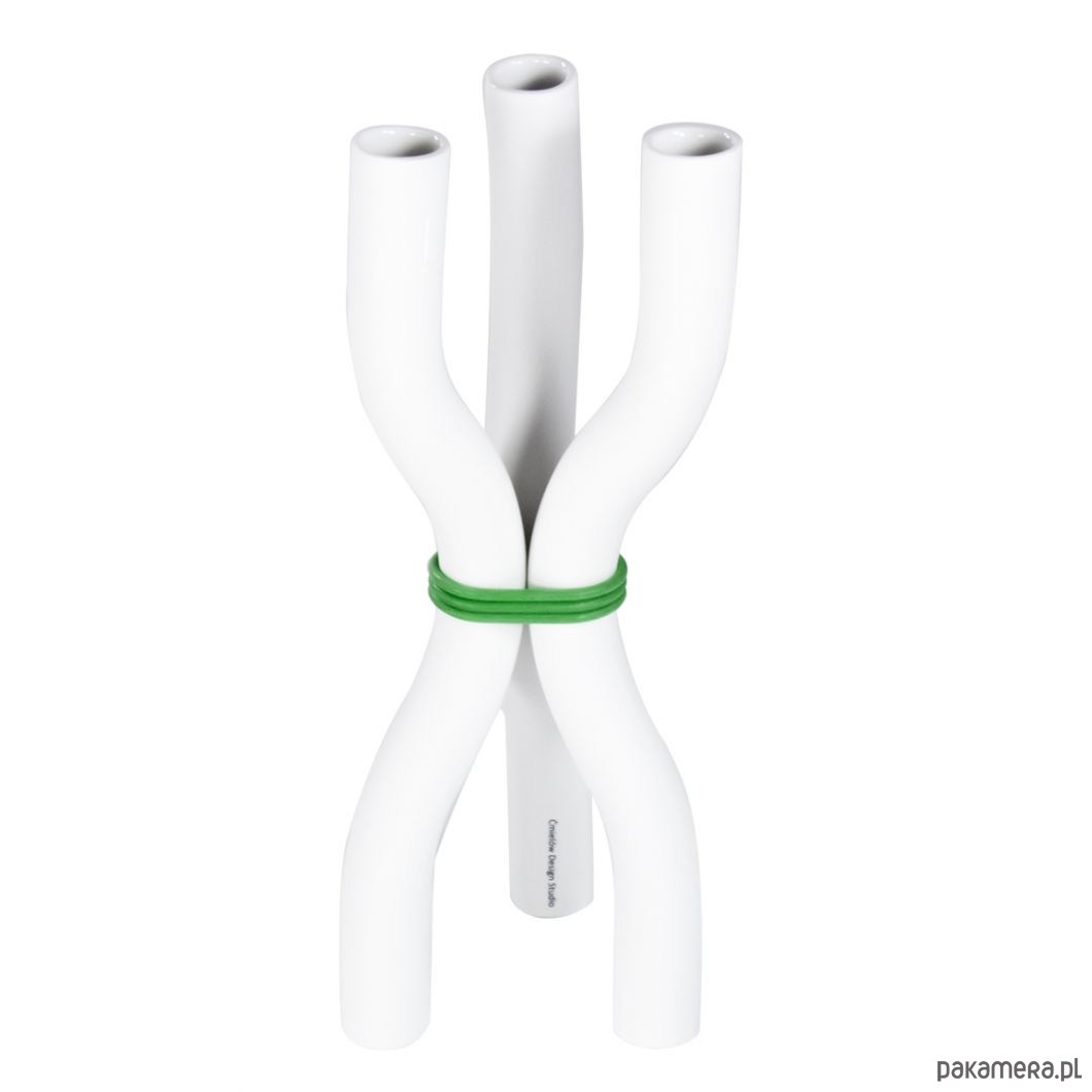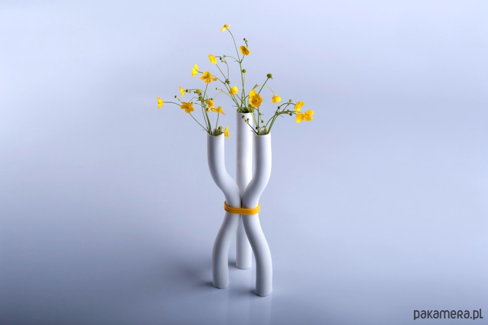 Wazon Trórka budują trzy ceramiczne rurki. Wygięte ku środkowi kolanka rurek przewiązane są silikonowym pierścieniem. Elastyczny pierścień umożliwia swobodne kształtowanie formy wazonu według własnych upodobań i zachęca użytkownika do eksperymentów. Silikonowy łącznik stanowi jednocześnie stabilizator dla całości. Delikatny kształt urozmaicony jest różnorodnym wykończeniem porcelany. Wazon szkliwiony od środka i matowy na zewnątrz, pięknie komponuje się z kwiatami polnymi. Ikebanowy charakter wazonu wpisze się w każdy styl wnętrza.