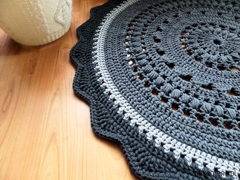 Dywan ręcznie wykonany na szydełku. Rodzaj sznurka :bawełniany Wymiary: średnica 100 cm Kolor : trzy odcienie szarego (ciemny, średni i grafit). Dostępność : gotowy do wysłania. Kolory na zdjęciu mogą delikatnie różnić się od rzeczywistych.