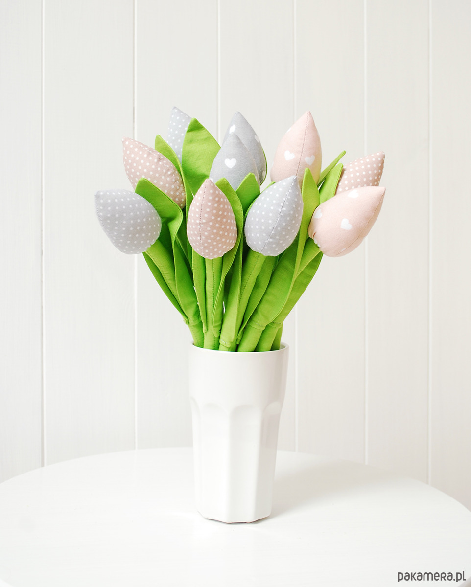 Bukiet 10 uroczych tulipanów uszytych z bawełnianych tkanin w odcieniach pastelowego różu i szarego: