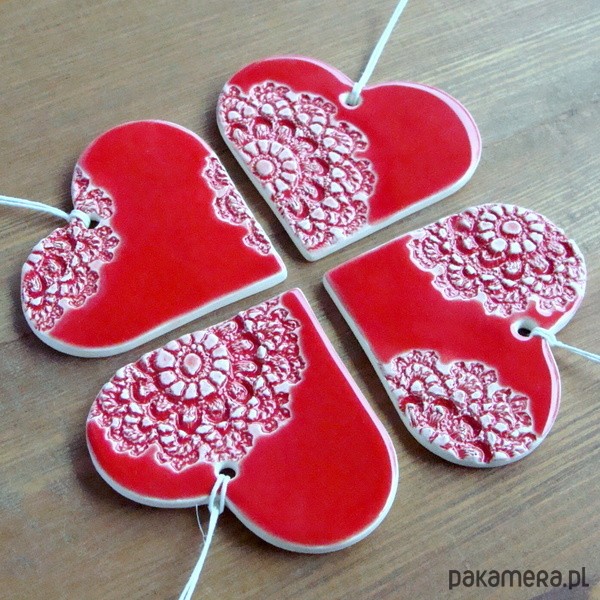 Zestaw 4 ceramicznych serc - błyszczących zawieszek w kolorze czerwonym, przyozdobionych motywem folkowym (fragmenty folkowe mogą różnić się od tych przedstawionych na zdjęciu). Zestaw zapakowany w tekturowe pudełko wyściełane siankiem drzewnym i przyozdobione ceramiczną zawieszką, przez co idealnie nadaje się na prezent. Wymiary zawieszek - ok. 7 x 6 cm. Polecam.