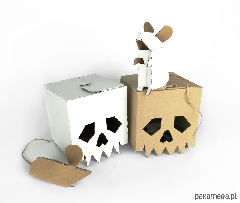 "Czaszki i myszy" to elementy dekoracyjne wykonane z tektury falistej. Z prostych płaskich wykrojów powstają przestrzenne formy, które mogą stać się częścią wystroju wnętrza, a także zabawkami dla dziecka, zachęcającymi do kreatywnej aktywności i swobodnego dekorowania np. farbami. Ponadto czaszki mogą także pełnić funkcję nietypowego opakowania na prezent lub słodycze rozdawane dzieciom podczas halloween.