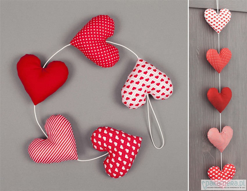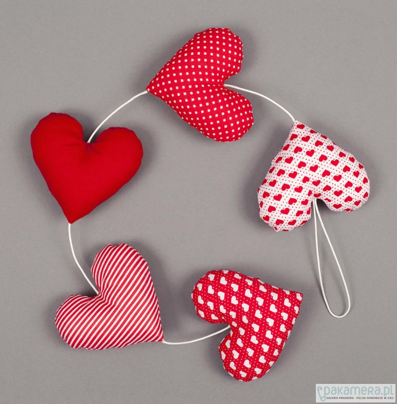 Ręcznie wykonana girlanda w kolorze czerwono-białym, każde z pięciu serc uszyte z innego materiału z zastosowaniem antyalergicznego wypełnienia. Girlanda pięknie ozdobi i ożywi każde wnętrze, wywoła uśmiech na twarzy obdarowanej osoby :) Długość całkowita to 65 cm., wielkość serc to 9 x 8 cm. Zapraszamy, pracownia m.i.