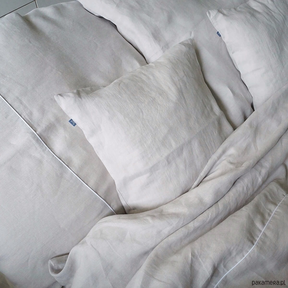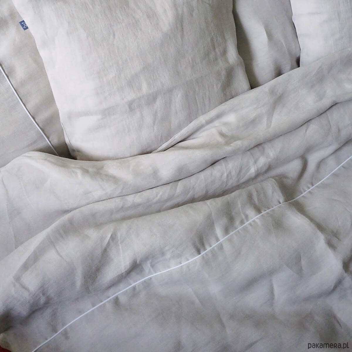 Lniana pościel z białą bawełnianą lamówką jest wyjątkowo zmysłowa i miękka w dotyku. Posiada właściwości antyalergiczne i antybakteryjne. Poprawia sen i samopoczucie. Jest wyjątkowo trwała, z każdym praniem staje się jeszcze bardziej szlachetna, miękka. Latem zapewnia przyjemne uczucie chłodu, a zimą grzeje nasze ciało. Lniana pościel korzystnie wpływa również na nasze samopoczucie i zdrowie. Struktura tkaniny delikatnie masuje ciało jednocześnie poprawiając krążenie.