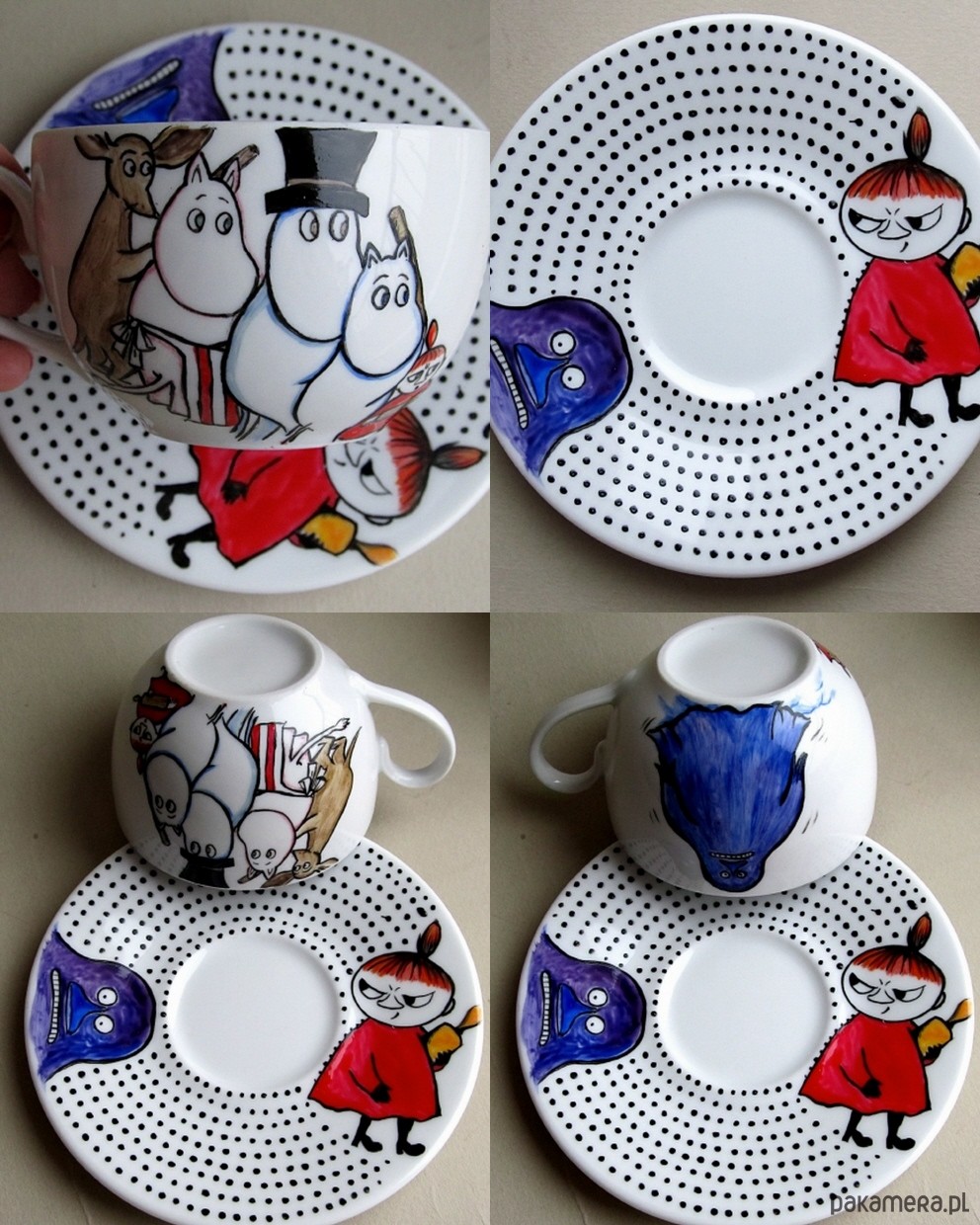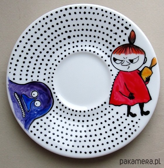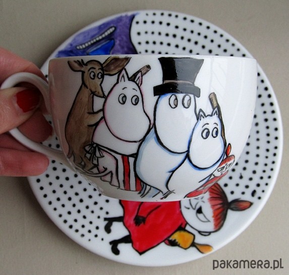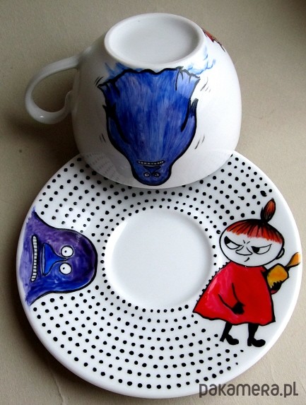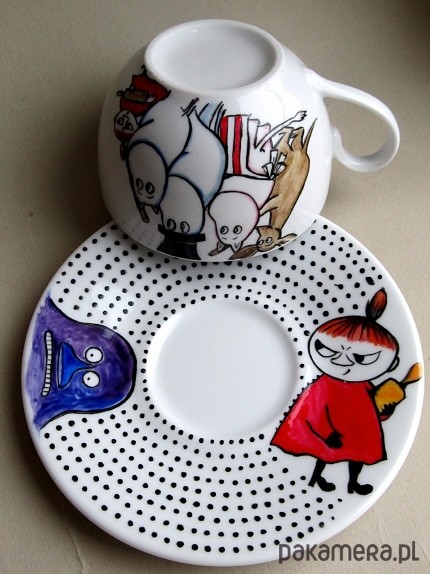 Wyjątkowa, ręcznie malowana, filiżanka z motywem bohaterów kultowej bajki - Muminki. Wspaniała jako niesztampowy prezent :). Wymiary: wysokość filiżanki - 6 cm , średnica filiżanki- 9 cm. Średnica spodka- 14 cm. Do malowania są używane farby utrwalane termicznie (w temperaturze 150 C). Ozdobione przedmioty można myć "standardowo" ciepłą wodą z płynem bez szkody dla namalowanego wzoru. Producent farb odradza jednak częste, długie namaczanie malowanych powierzchni i szorowanie ich ostrą myjką ponieważ po jakimś czasie może to uszkodzić dekorację.
