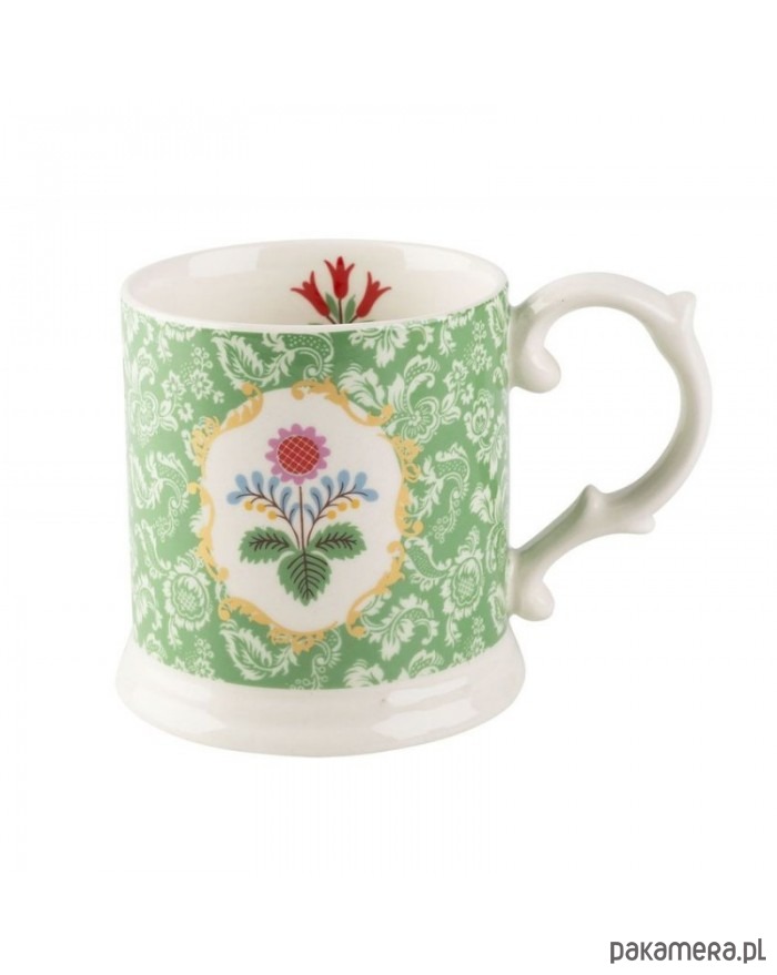 Kubek ceramicznym w stylu folkowym. Bardzo ozdobny i dekoracyjny. Ucho także ma bardzo ciekawy kształt. Zalecane mycie ręczne. Pojemność: 320 ml.