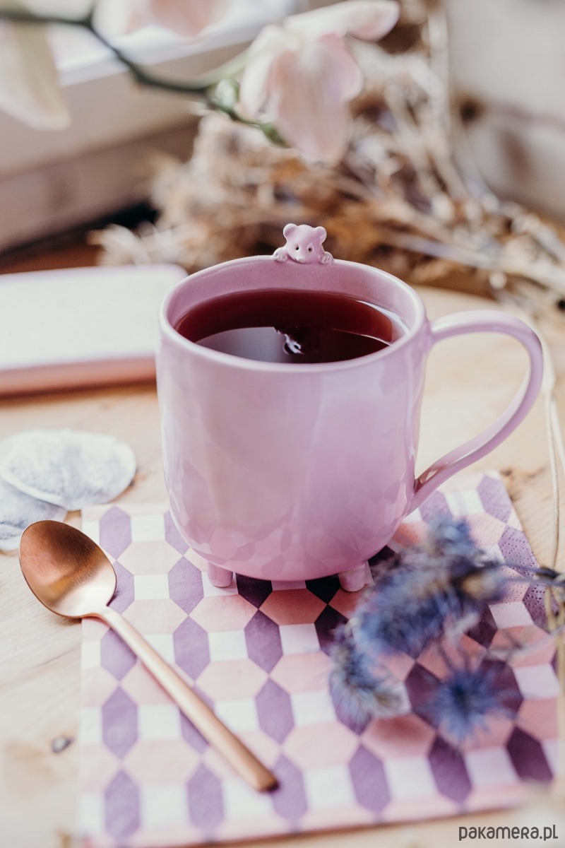Duży kubek ceramiczny na który wspina się mały grubiutki miś. Będzie on uroczym towarzyszem porannej kawy, bądź relaksującej herbaty.