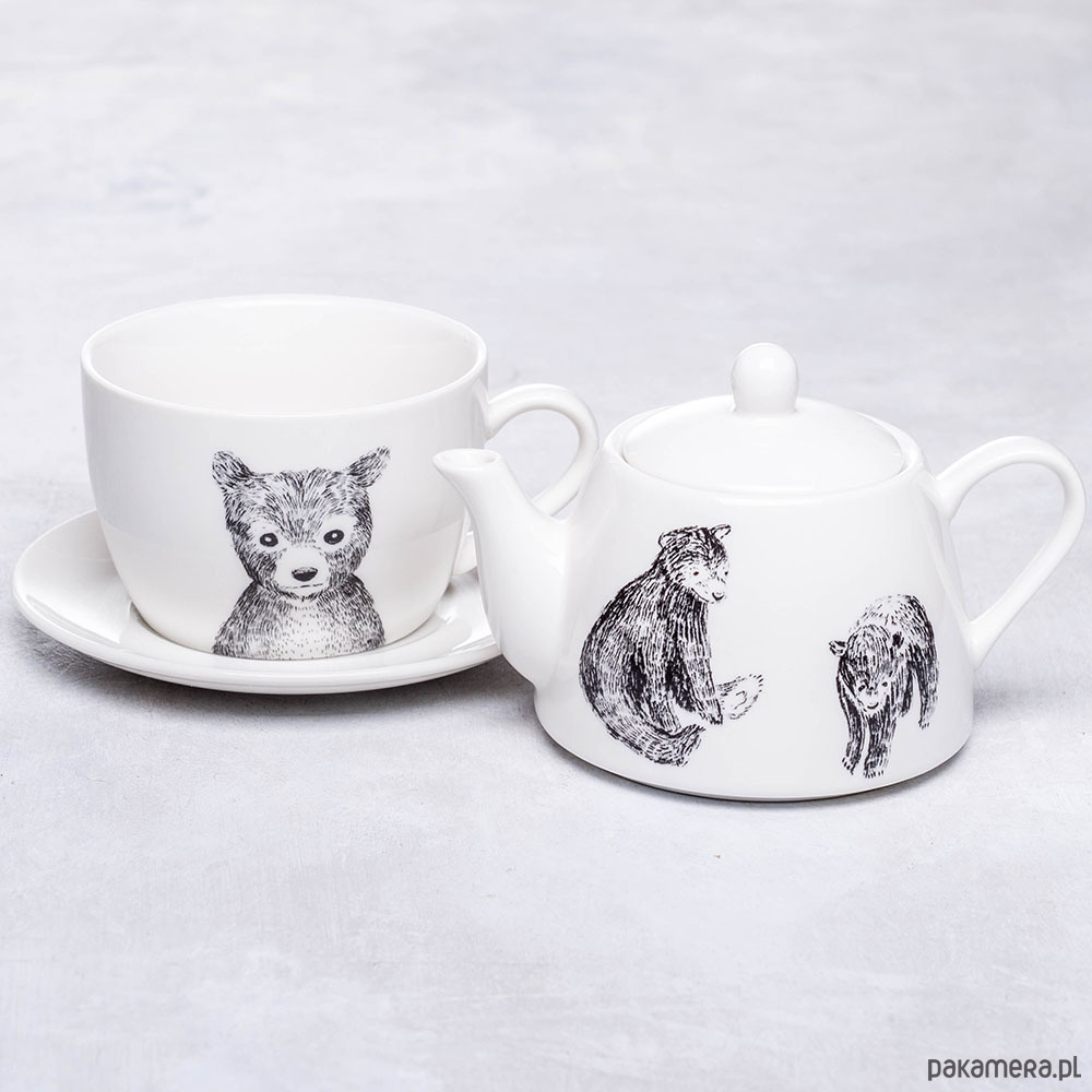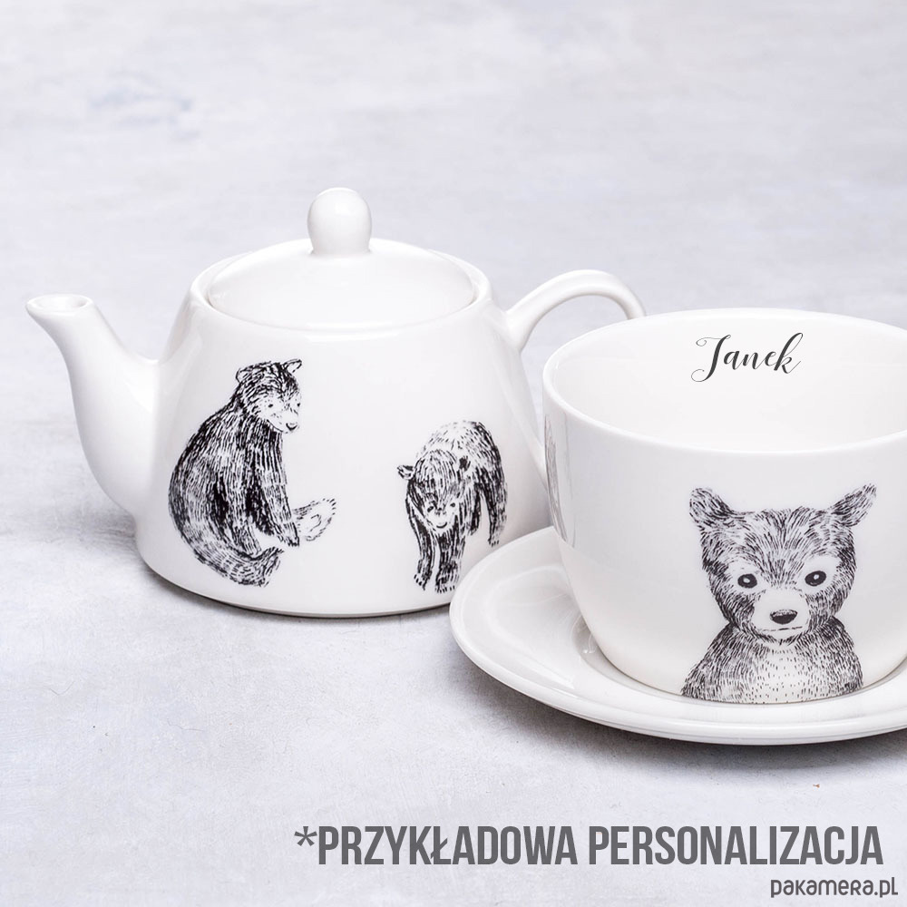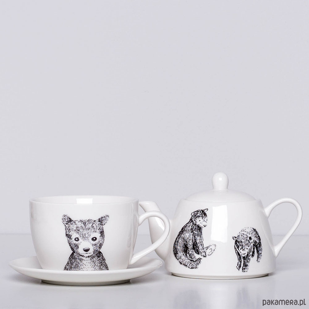 Zestaw do herbaty składa się z czajniczka i filiżanki ze spodkiem. Całość ozdobiona jest naszymi autorskimi ilustracjami niedźwiedków.