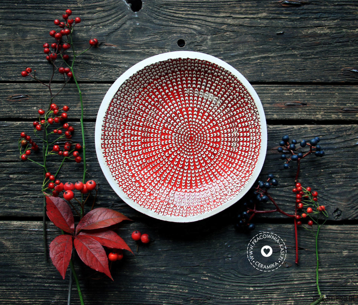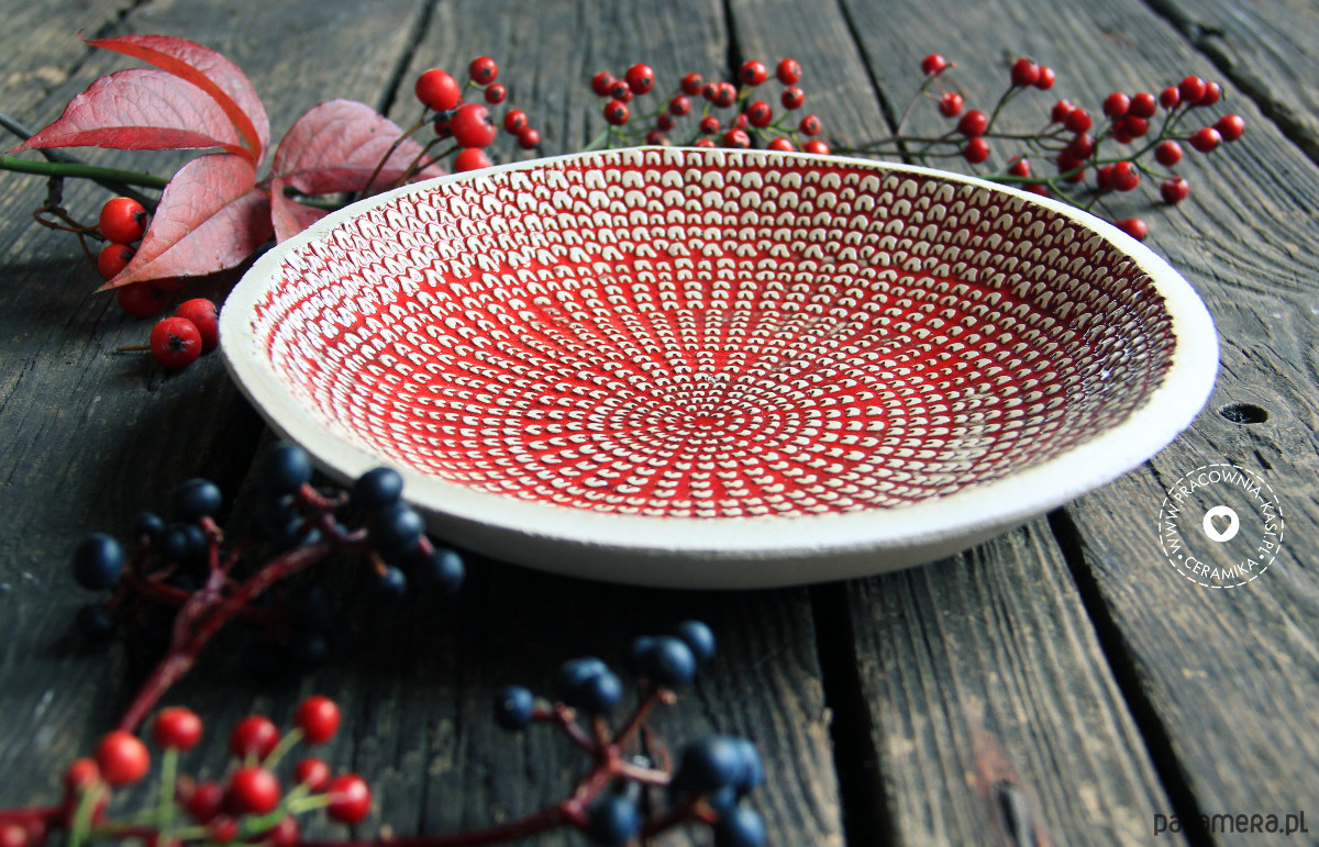 Paterka ulepiona ręcznie z białej gliny, środek ma ciekawą fakturę i jest szkliwiony błyszczącym, czerwonym szkliwem, brzeg i spód: surowa glina. Średnica 22 cm.