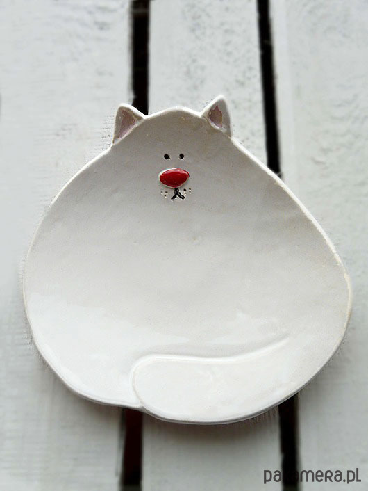 Ceramiczny talerzyk w kształcie kota z czerwonym noskiem, kocimi uszkami, zawiniętym ogonem i uśmiechem. Talerzyk może służyć do podawania drobnych potraw, słodyczy, przechowywania niewielkich rzeczy, jako mydelniczka lub podstawka na świece.