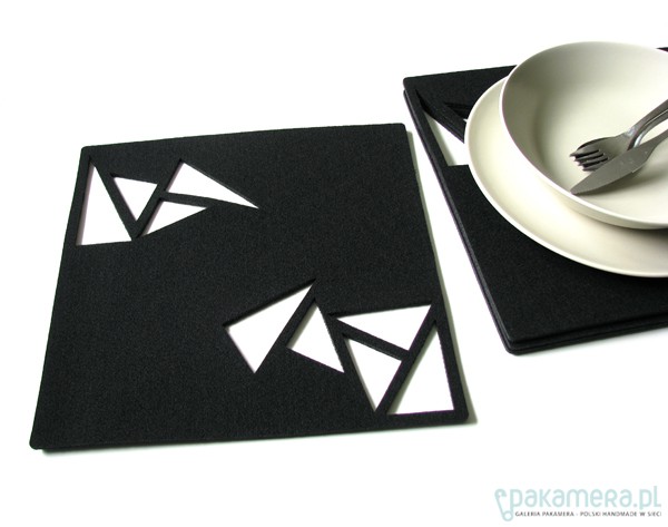 Zestaw czterech kwadratowych podkładek pod talerze. Wycięte laserowo w czarnym filcu 3mm, spodnia strona lekko impregnowana, co dodatkowo chroni stół przed zniszczeniem. Wzór prosty, geometryczny, pięknie komponuje się z nowoczesnymi wnętrzami. Polecam, podkładka kwadratowa, długość boku 30cm (projekt autorski z pracowni Home Variety, wszelkie kopiowanie zabronione).